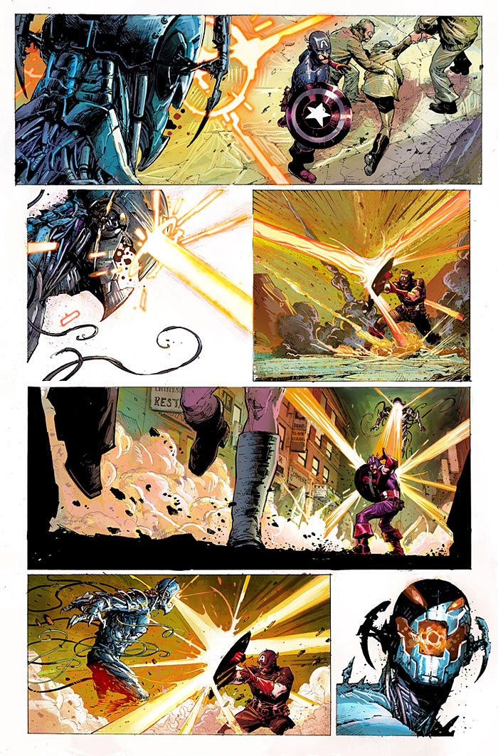No hace ni un mes que destacaba en el blog a Jerome Opeña, lamentándo su escasa producción de 2014. Ahora se ha confirmado que está trabajando en una nueva Novela Gráfica de Los Vengadores: Rage of Ultron. Este nuevo trabajo se publicará en Abril de 2015, coincidiendo con la nueva película de Vengadores: Age of Ultron. Opeña vuelve a colaborar con Rick Remender, con el que ya trabajó en Fear Agent o X-Force, y el arte es espectacular!!! Es alucinante el storytelling de este autor, que te traslada por la acción sin necesidad de textos de apoyo, demostrando porqué es un fijo en cualquier lista de dibujantes TOP de la actualidad. Ultron hace años que no es tan amenazador como en esta previa.
