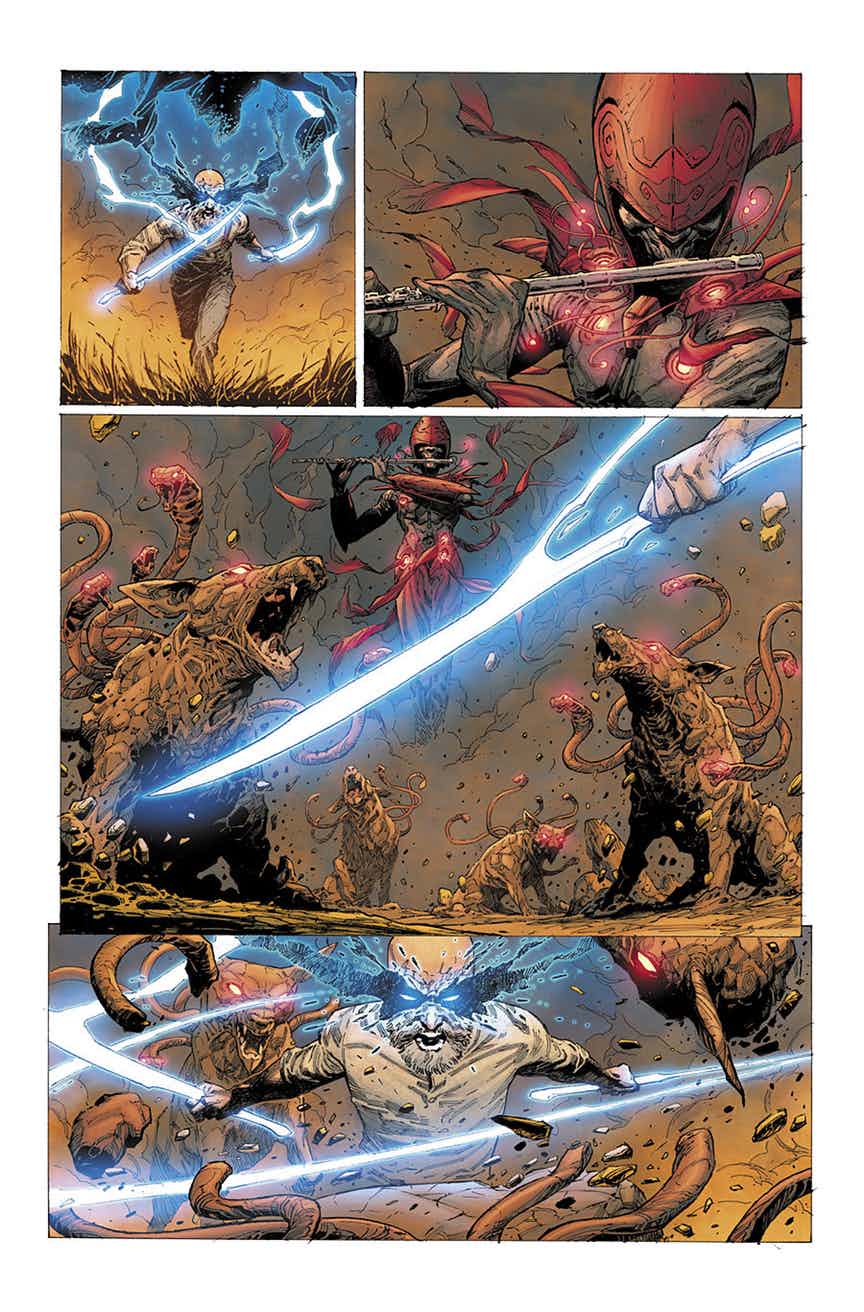 En el acabado artístico, Jerome Opeña con colores de Matt Hollingsworth, realiza un notable trabajo con el diseño de los personajes y su mundo, pero creo que la historia de Remender no le da verdaderos momentos para lucirse. En todo caso, comparto algunas páginas del primer número sin rotular para que podais disfrutar de su increíble fluidez narrativa, que permite seguir perfectamente lo que está pasando sin necesidad de textos de apoyo.