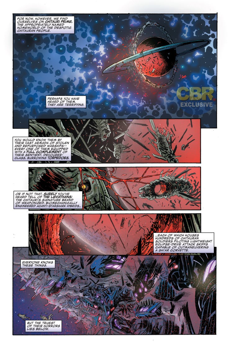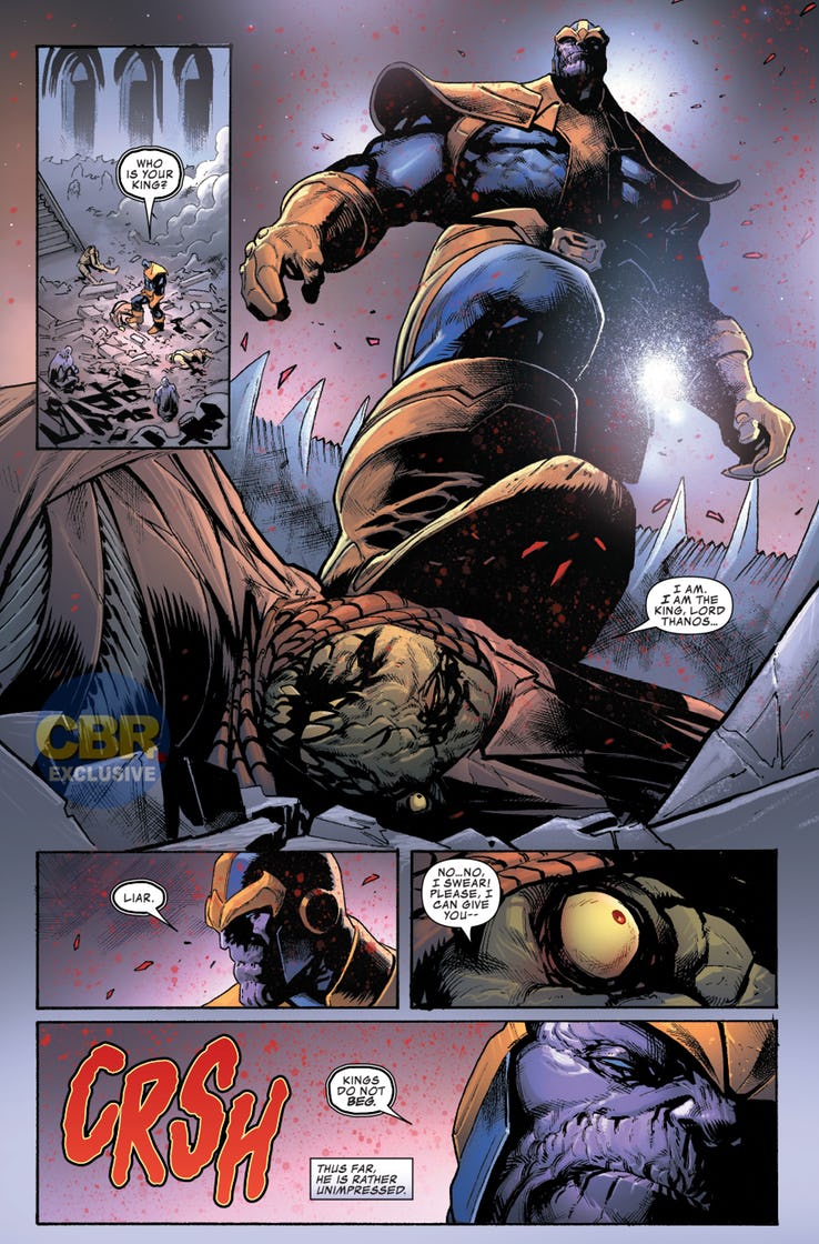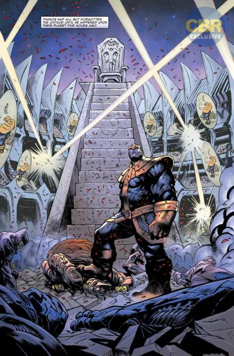 Comparto a continuación las primeras páginas de Thanos vence, publicadas en las páginas de CBR, para que veáis un preludio de los que os espera y del estilo de Geoff Shaw:
