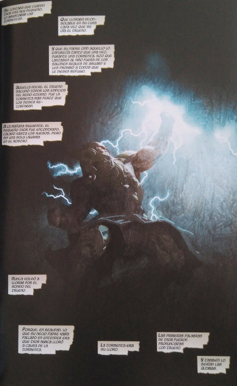 2590 días de Trueno. Julián Clemente en el Spot On de este cómic nos informa de los días transcurridos desde que se publicó en USA el primer número de Thor God of Thunder hasta este King Thor 4. Siete años en los que Jason Aaron ha contado las aventuras del mejor Dios de todos, aquel que debe luchar cada día, además de contra los villanos de turno, consigo mismo, con sus dudas y sus miedos, para intentar ser el mejor héroe posible, alguien que gustosamente se sacrificaría por nosotros.