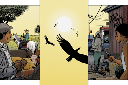 Junto al extraordinario dibujo de Martín sobresale también el impactante color de Muntsa Vicente. El comic claramente está dividido en dos partes. En la primera, donde asistimos al viaje de Óscar desde Honduras hacia los Estados Unidos y la vida de Liddy en su rancho en texas, emplea una paleta de colores realista que encaja sin estridencias con los lápices de Martín. Es en la segunda parte del comic en los que su arte estalla, creando una explosión de color que ayuda a resaltar la naturaleza alienígena en la que los protagonistas se encuentran. El apartado artístico de este comic me parece una pasada alucinante.