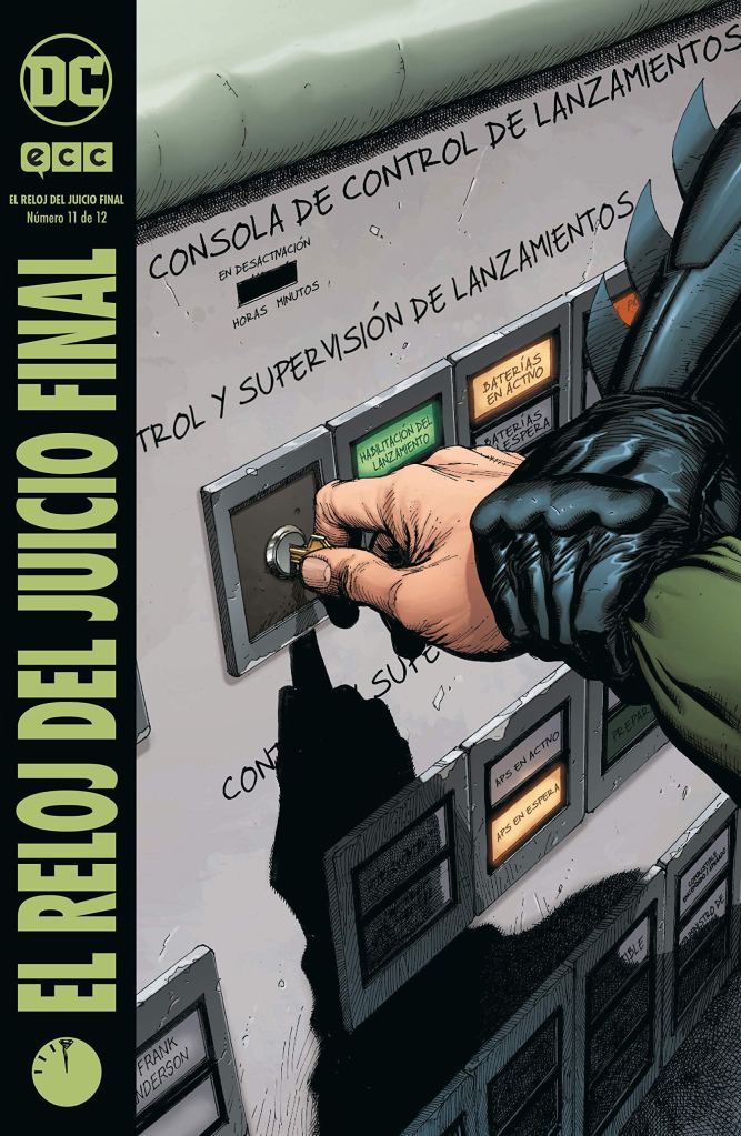 Otro elemento derivativo de este El Reloj del Juicio Final es el propio diseño de la portada, con el primer plano de la primera viñeta del comic, que a su vez es un elemento secundario de la historia, con el título del comic en vertical con la misma tipografía que se usó en Watchmen, en el lado izquierdo de la portada. Este elemento también puede ayudar a provocar la confusión que comentaba antes, al pensar un lector no habitual que van a leer un nuevo comic de Watchmen, cuando diría que este comic es en realidad una historia del Universo DC en la que aparecen algunos personajes del Watchmen original de Moore y Gibbons, junto con algunos nuevos.
