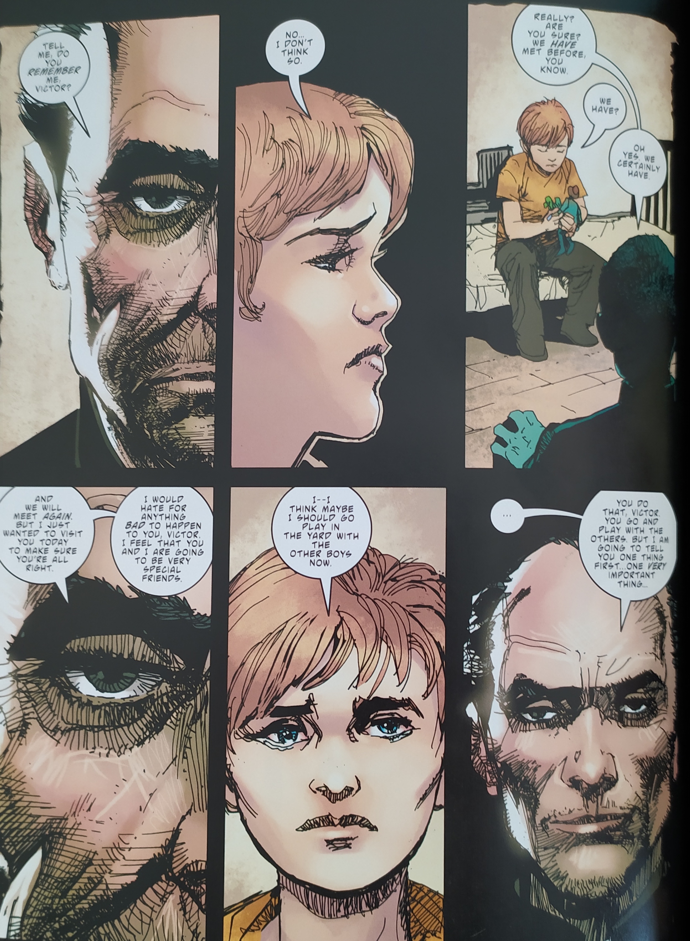 Sin embargo, el guión es un absurdo porque por un lado dice que hay una presencia maligna que ha controlado Hub City durante siglos y que es la responsable de todo el mal existente que le ha pasado a la ciudad en general y en concreto a Vic Sage, como si fuera él el avatar de algún tipo de fuerza del bien. Pero a la vez, resulta que al final el problema de la ciudad no es un demonio etéreo sino de la gente, ya que la sociedad en general es racistas, violenta, etc… Es un todo vale que no llega a dar respuestas a nada porque incluso las preguntas acaban siendo una locura, de forma que la historia y sobre todo la forma en que nos la ha contado Lemire es la nada más absoluta.