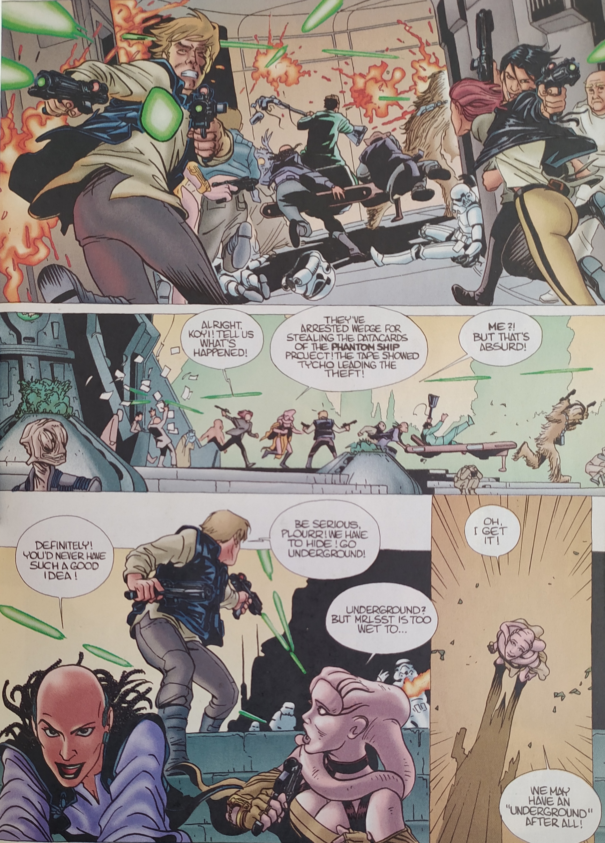 Sin embargo, Allen Nunis que dibujó el primer arco «The Rebel Opposition» y sobre todo John Nadeau, que dibujó los arcos «Battleground: Tattoine», «The Warrior Princess» y «In the Empire´s Service» los vi super flojos, dibujando unos personajes genéricos que a veces se confunden y una acción sin fuerza ni momentazos destacados. En el caso de Nadeau, me parece curioso comprobar cómo sus portadas son estupendas, pero sin embargo la narrativa interior se me queda muy corto. Y es una pena, porque una buena historia con gran dibujo crece y sin embargo un dibujo convierte el comic en montonero.