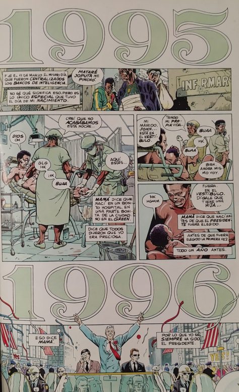 Bajo el prisma del clásico lema de “show, don´t tell”, el futuro de Miller nos muestra un montón de situaciones terribles que el lector sabe interpretar sin necesidad que nadie nos venga a contar “mira que malo es el racismo, la destrucción del medio ambiente, etc…” como lamentablemente nos pasa en obras de comic, cine y televisión actuales que dejan de ser entretenimiento para convertirse en panfletos políticos infumables con la excusa de tratar temas “importantes”.