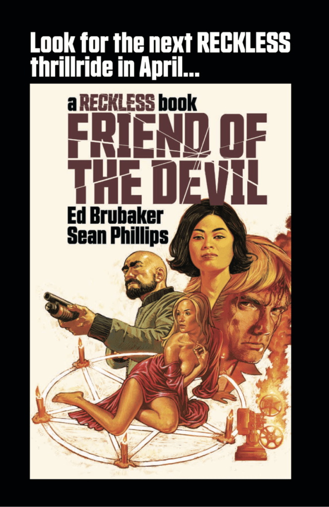 Tras el parón que el COVID provocó en la industria, que para Brubaker y Phillips supuso el retraso de 3 meses en la publicación de su excelente novela gráfica Pulp, estos autores aprovecharon el parón y la incertidumbre para poner en marcha su idea más ambiciosa hasta la fecha que ofrece una importante novedad para la industria. No sólo por el hecho de publicar su nueva obra directamente en formato de Novela Gráfica, saltándose el paso previo de la publicación en comic de grapa que posteriormente eran recopiladas en tomos, sino por la ambición de publicar 3 novelas gráficas de 144 páginas cada una en un periodo inferior a un año, para seguir transmitiendo la idea que siguen publicando periódicamente, aunque ya no a través de las grapas. De hecho, su segunda novela gráfica de Reckless: Friend of the Devil ya está finalizada y se publicará en abril. Por poner contexto este dato, publicar en un año 3 novelas gráficas supone producir más de 420 páginas en este periodo. Teniendo en cuenta que un comic de grapa en la actualidad cuenta con 20 páginas (en general), esto significaría que Brubaker y Phillips planean publicar el equivalente de 21 grapas en un año. Comparadlo con el 99% de dibujantes actuales que no puede estar más de 6 números seguidos en una serie sin necesitar un descanso y comprenderéis la escala de lo que están consiguiendo estos autores. Con el añadido que no son historias montoneras, sino lo mejor de lo mejor. ¡Qué bárbaros!!