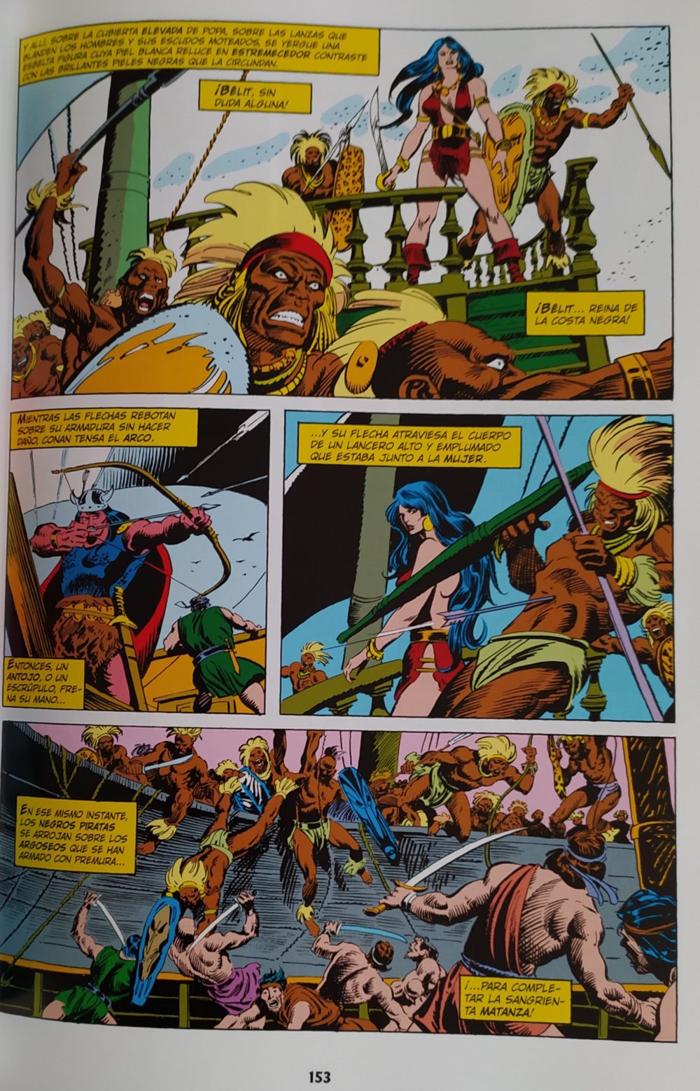 Como comentaba en mi primer post sobre estos comics, tenía unas ganas especiales de comprar y poseer estos comics clásicos que no llegue a comprar en su día. Estos comics los leí en casa de unos primos de Madrid a los que visitábamos de cuando era niño durante las vacaciones de Navidad. Recordaba estos comics con mucho cariño, y de todos ellos, la figura de Bêlit y su historia me impactó mucho de niño. Acostumbrado como estaba a que Conan tuviera una novia en cada historia, ver que se enamoraba y corría aventura con una dura y bella mujer que le miraba de tu a tu fue uno de los momentos culminantes para mi del personaje. Así que en parte puede decirse que si me decidí a comprar estos Ómnibus fue precisamente para poder volver a leer esta historia de amor condenado y saber que ya jamás se me iba a escapar. Y en este volumen encontramos la primera mitad de una historia que terminará en el próximo.