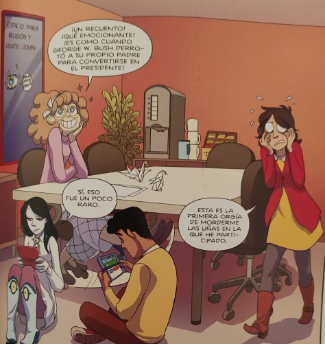 En el apartado artístico, el dibujo de Max Sarin con color de Whitney Cogar está super chulo. Sus expresiones faciales y la comunicación no verbal que tienen todos los personajes en cada viñeta ayuda que la experiencia lectora sea estupenda. Aparte de lo divertidas o alocadas que son cada situación, el dibujo de Sarin provoca que quieran detenerte un poco más de la cuenta en cada imagen, para admirar esa mano, ese pequeño detalle impreso en la escena que ayuda a que el momento sea aún más divertido. Me declaro super fan.