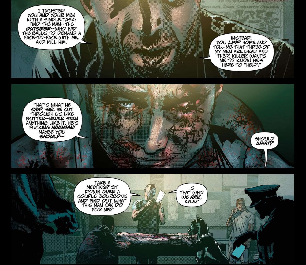 Otro elemento interesante del guión es que excepto por el personaje de Alfred, he visto a un Ellis más comedido que de costumbre con personajes contenidos y alejados del “super-molonismo” y las frases lapidarias con las que suele acompañar otras obras suyas. Bruce es la principal prueba de esto y nos lo muestra tan concentrado en resolver los misterios que se le van presentando olvidándose incluso de cuidarse ante las heridas que va recibiendo en el camino.
