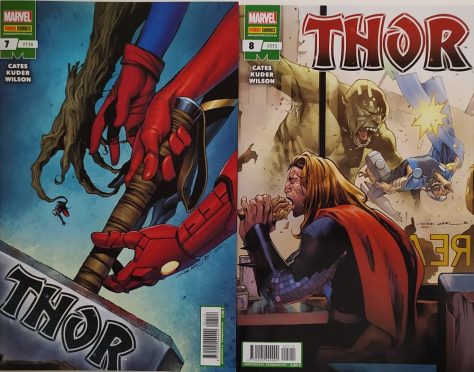 Veo lógico que tras un momentazo como fue el primer arco, el comic continúe con algo ligero que permita aliviar la tensión y construir el siguiente arco, pero no se si me va a encajar a donde nos está llevando. Había leído a gente calificar a Cates de “reciclador” de ideas antiguas, pero dado el nivel de disfrute de su Veneno o Thanos, no veía eso como algo malo. Sin embargo, el aparente retorno de Donald Blake, desaparecido desde hace ni me acuerdo, no se si es una idea de la que pueda salir algo que vaya a ser recordado. En todo caso, como en todo, el problema no es la idea sino la ejecución y de momento Cates se ha ganado el beneficio de la duda y el querer ver a donde está dirigiendo a Thor.