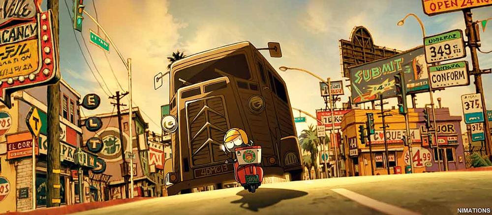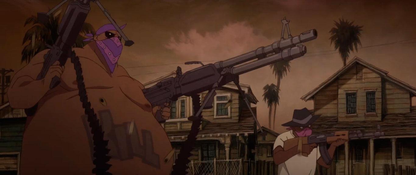 El movimiento de Angelino, el protagonista, por los barrios bajos de Dark Meat City ofrece un listado de lugares comunes del noir y la ciencia ficción a mostrarnos a un huérfano perdedor perseguido en un barrio hostil por poderosos con conexiones con un pasado que había olvidado y que volverá a golpearle con fuerza. Es curioso que dentro de una animación y unos personajes y diseños de secundarios bastante realistas, Angelino y sus amigos Vinz y Willy tienen un diseño super cartoon que choca con las escenas de ultraviolencia que vamos a vivir en una ambientación casi como si estuviéramos en South Central de L.A. Me parece un elemento curioso y, dentro que sigo sin tener claro si me han funcionado estos diseños, sí veo claro que son elementos irreales que ayuda a dar a la historia un toque sobrenatural imprescindible para que la historia funcione.