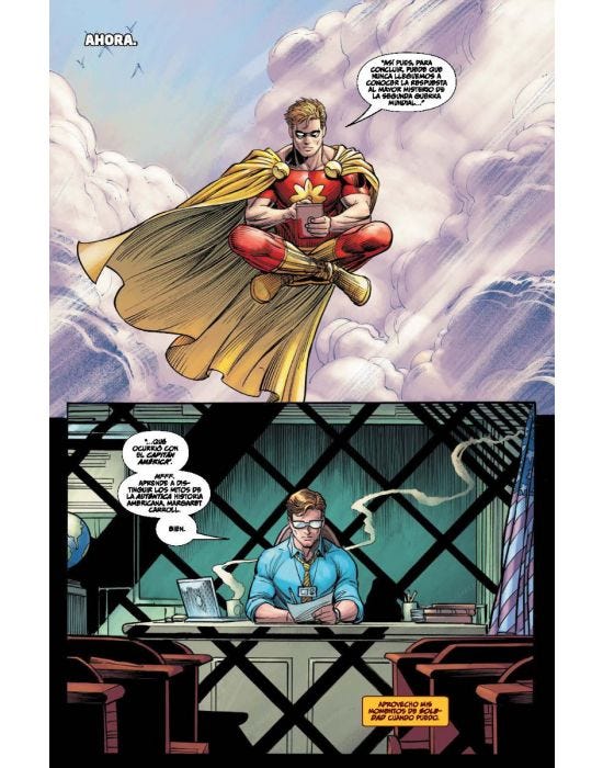Esto de hecho es el principal pero del comic, unido por supuesto al baile de dibujantes que me parece terrible. Y es que es entendible y lógica la intención de Aaron en contar una historia de cada miembro del Escuadrón Supremo en cada grapa, de forma que empaticemos con ellos y pueda haber cierta duda cuando acaben enfrentándose a los Vengadores. Pero teniendo en cuenta que en el próximo número (números 4 y 5 USA) se centrarán en Doctor Espectro y Halcón Nocturno, no cabe duda que en el 6 USA tendremos a Princesa Poder, la versión de Wonder Woman del Escuadrón Supremo, mientras que la reunión de Los Vengadores también se irá produciendo uno a uno en cada grapa. De forma que ya sólo quedará tiempo para el enfrentamiento final en el séptimo y último número de esta serie, lo cual me mostraría un comic creado con plantilla sin sorpresas.