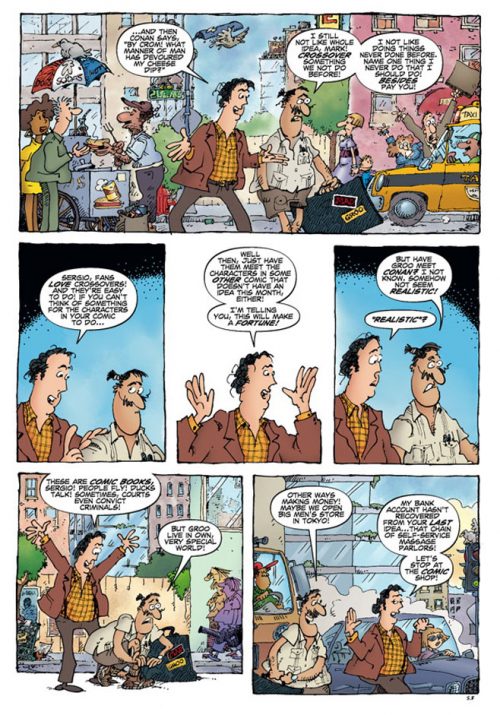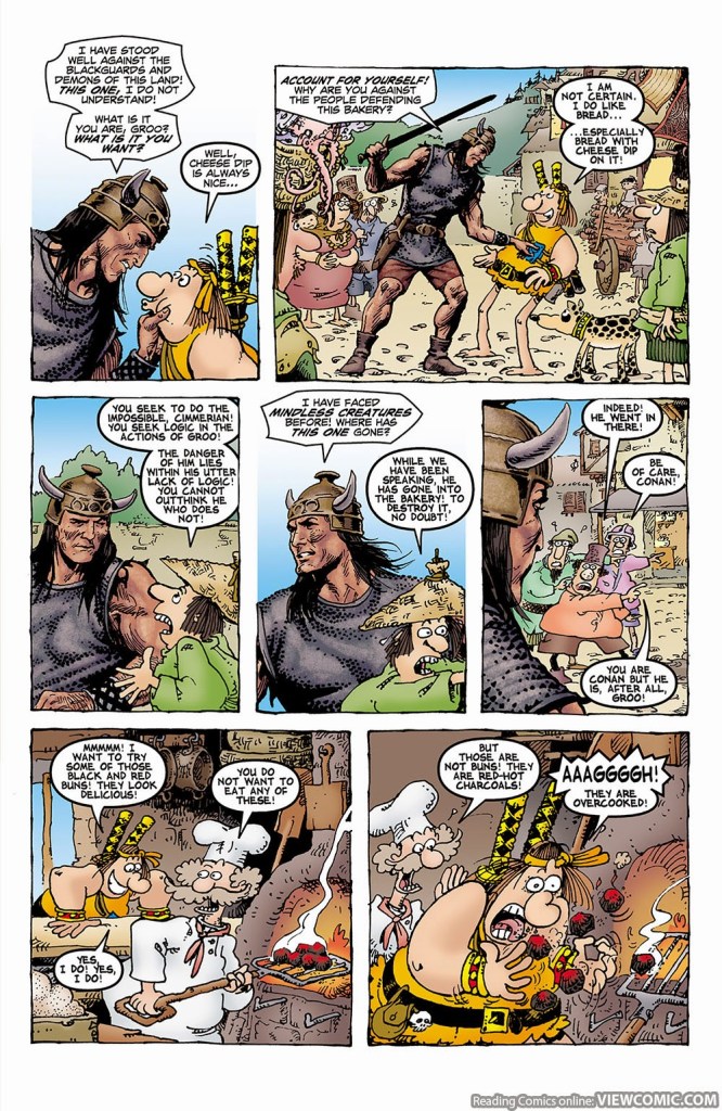 Además de mezclar los mundos de Conan y Groo, Aragonés y Evanier plantean una historia ambientada en el presente que comparte temática. En ambos casos, un poderoso quiere destruir un pequeño negocio local y Groo y Conan por un lado, y Aragonés y Evanier por otro, intentarán impedirlo. Las similitudes en ambas historias y las divertidísimas situaciones que plantean convierten la lectura en un éxito total. Yo mismo reconozco que a veces minusvaloro la valía de comics (u otras obras) de humor, pero tengo que reconocer que este comic me ha llegado en un momento personal en el que realmente he agradecido este humor blanco y el buen rato que me ha hecho pasar.
