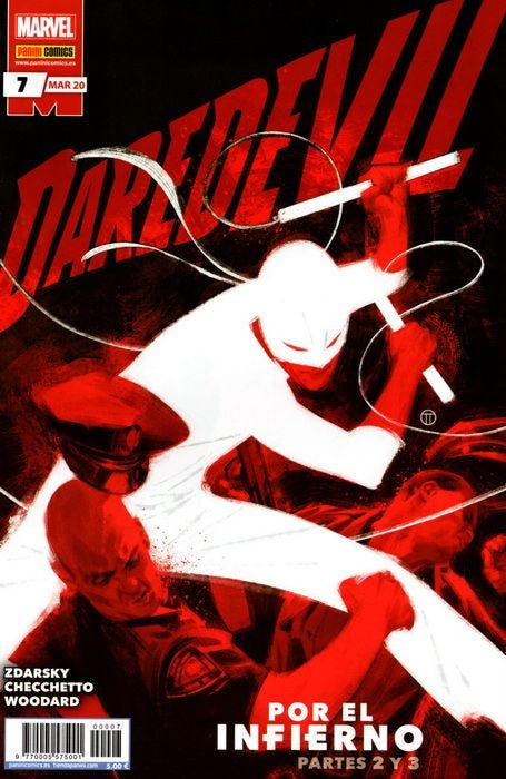 Comentaba que me gusta la sensación realista que los primeros comics ofrecían y en general la idea central sobre que los superhéroes enmascarados deben ser responsables de sus actos y, en su caso, pagar el precio que las leyes establezcan. Esa idea es muy potente y ofrece un marco narrativo super interesante que encaja como anillo al dedo a Matt Murdock. Y si está dibujado por Checchetto, mues mucho mejor. Lo malo es que una vez Zdarsky nos sorprende con el giro al final de Verdad / Atrevimiento en el que Matt se declara culpable y acepta ir a prisión aceptando su responsabilidad por la muerte del raterillo allá por el número 1, la ejecución deja mucho que desear.