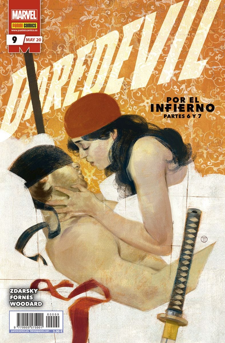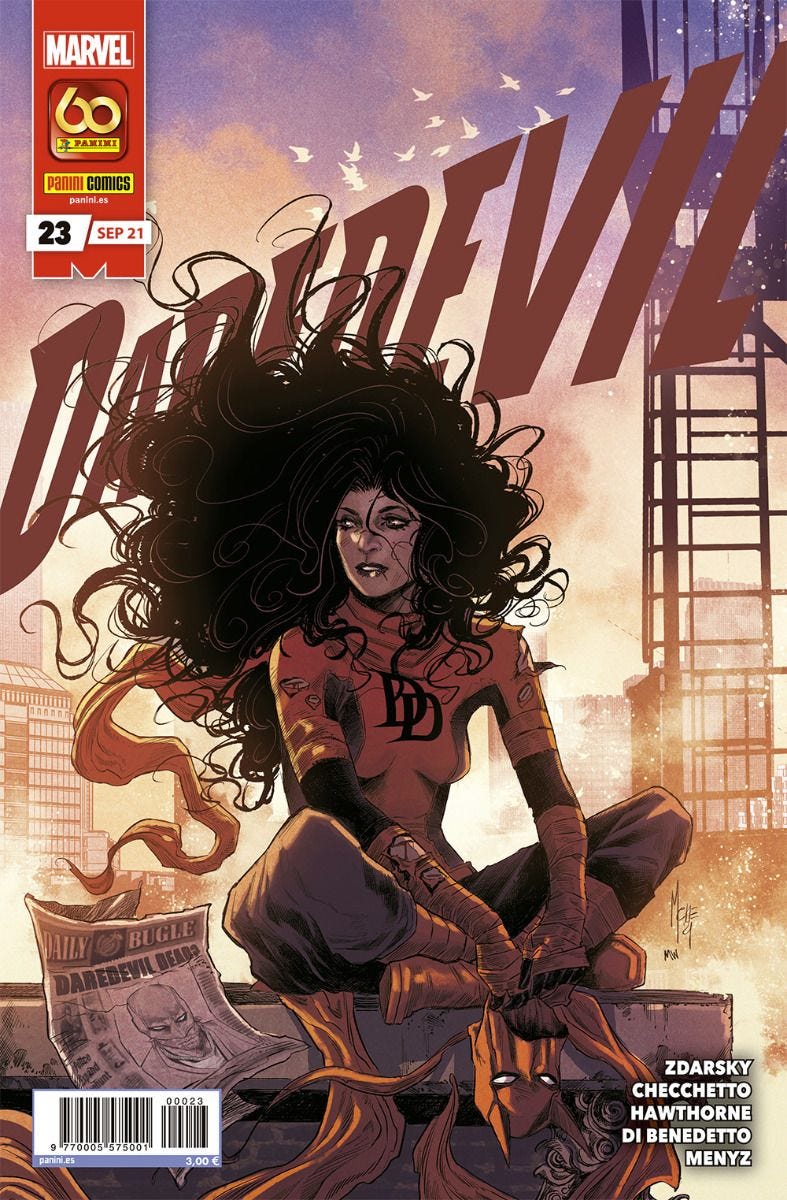 Mike Hawthorne me parece un buen dibujante y está correcto en los números que dibuja, pero no evita a que se eche muchísimo de menos a Checchetto en cada grapa que no está. Y aunque es cierto que Checchetto dibuja más del 50% de los 30 números USA y que Zdarsky adapta su historia para que Checchetto pueda dibujar en varias grapas aunque no dibuje el comic en su totalidad, como en el caso del tie-in con El Rey de negro, en que Checchetto se encarga de la parte de Elektra en Nueva York mientras que Hawthorne se encarga de la parte de Matt en prisión, el resultado final de deja se ser un pelín insatisfactorio por todos los cambios de dibujo.