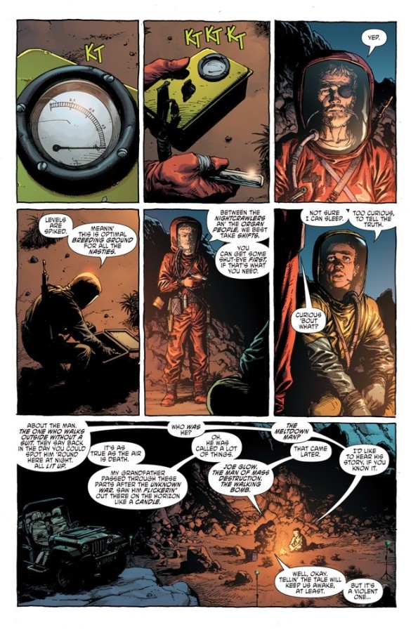 ¡El equipo aclamado por la crítica del escritor GEOFF JOHNS y el artista GARY FRANK se une al colorista superestrella BRAD ANDERSON para traer a Image Comics a su primer héroe de creación propia! Ambientada en los años posteriores a la devastación del planeta por una guerra nuclear, forajidos desesperados luchan por sobrevivir en un mundo de caos radiactivo. Más allá del páramo envenenado vive un hombre al que incluso los Nightcrawlers y Organ People temen. Algunos lo llaman Joe Glow, otros lo llaman Meltdown Man. Pero su nombre … es Geiger.