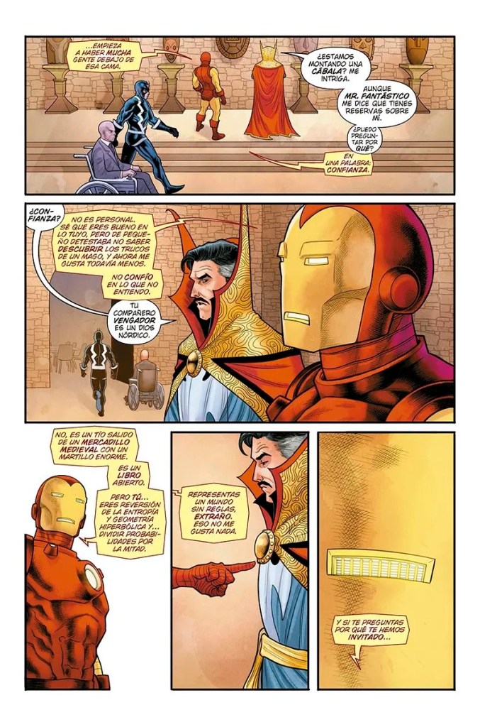 MacKay plantea un comic ágil con buenas sorpresas en todas las grapas que consiguen atrapar al lector de la mejor forma posible y, de forma lógica para lo que la historia necesita. Tras el desastre de El juicio de Magneto de Leah Williams, un comic también planteado inicialmente como un whudunit que acabó siendo un despropósito, hay que valorar los comics bien escritos, y este lo es. No sólo en lo relativo a la trama, sino también con unos diálogos que han hecho interesante todo lo que nos contaban, empezando con la construcción de Stephen Extraño y, más adelante, la de sus seres queridos que tienen que enfrentarse a una amenaza para la que no están preparados. El único detalle menos bueno del guión es todo lo relacionado con Las Tres Madres, las villanas más grandes que la vida que vienen a destruir la Tierra ahora que su defensor ha caído, que me han parecido super genéricas y olvidables de principio a fin.