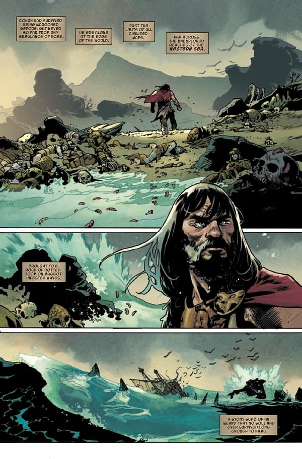 Este Conan sigue siendo una fuerza de la naturaleza, pero también transmite que tiene una pesada carga a sus espaldas que acabaremos descubriendo. Además, el color también ayuda a transmitir que esta isla a la que llega Conan es un lugar de pesadilla al final del mundo de donde va a ser imposible escapar, además de la categoría mítica de la historia.