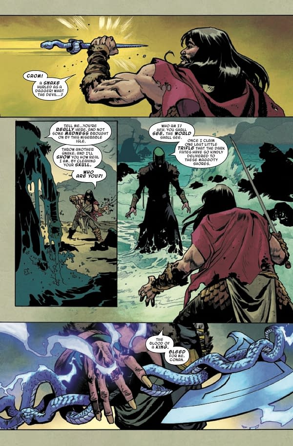 King Conan es el siguiente trabajo de Jason Aaron, Mahmud Asrar y Matthew Wilson con el personaje creado por Robert E. Howard tras su excelente primera serie de 12 números «The life and death of Conan», que pretendía hacer un viaje por la rica historia del personaje. Aaron se emplea a fondo para construir una historia planteada de nuevo como «la última historia de Conan», y utiliza al mago Toth Amon como enemigo, un villano que curiosamente no llegó a coincidir nunca con el cimmerio en las páginas escritas por Howard. King Conan es además una historia de legado y de las cosas que se recuerdan y que hacen que las historias se conviertan en mitos.