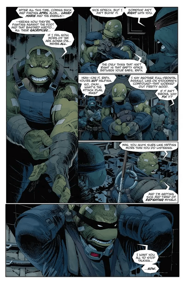 En todo caso, agradezco que hayan comics como este que obliguen a un cuarto de hora de lectura, dada la tendencia que estoy viendo en otras series en las que te lees la grapa del mes en tres minutos escasos. No he leído los comics actuales de Las Tortugas Ninja, pero creo que esta miniserie lo tiene todo para conseguir que lectores veteranos como yo nos sintamos tentados de reengancharnos a la tortugamanía comiquera.