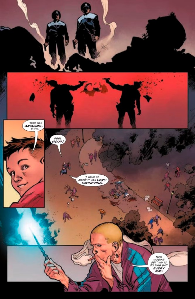 Los comics de Millar son creados a partir del «high-concept» y otro elemento que le noto es que pecan de unos personajes super arquetípicos, empezando por la protagonista a la que vemos en la primera viñeta borracha y desnuda tras haber disfrutado de una noche de juerga con un desconocido. Todos tienen que ser tan molones super-cool y a la vez malotes y peligrosos, que acaban siendo personajes sin personalidad con los que es imposible empatizar.
