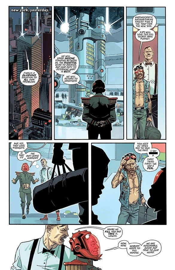 Leyendo entrevistas a Remender, él ha comentado en muchas ocasiones que de joven formó parte de la escena punk y anarquista de la Costa Oeste, (mal) viviendo en casas de amigos hasta que pudo empezar a trabajar como animador en películas como El gigante de hierro (1999) Titán A.E. (2000). Su mentalidad antisistema es algo que hemos leído en comics suyos como Deadly Class o más recientemente Death or Glory, no es algo que sorprenda o que sea un cambio reciente. Y es por esto que es normal que el liberal y libertario Remender vea lo que está pasando en la sociedad americana de la actualidad y no pueda estar de acuerdo ni con lo que hacen los simpatizante republicanos de Trump que entrarían de lleno en la ultraderecha, ni tampoco con la deriva de la izquierda radical americana. Y es precisamente contra ambos grupos contra los que Remender dirige una acertadísima crítica planteada como una historia over-the-top que bordea la farsa en muchos momentos.
