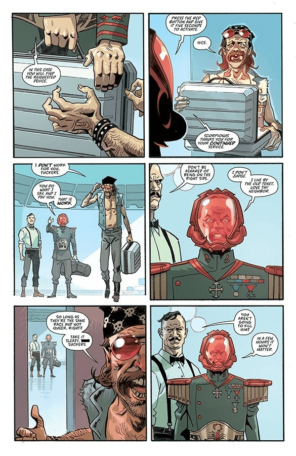 Todas las personas normales sabemos que los nazis son lo peor, no hay ninguna duda sobre ello. Y Remender realmente se ríe sin pudor de sus villanos para esta historia, Scorpionus, Unos nazis de opereta que resultan especialmente penosos y que enlazan además con los villanos de Spectra de las películas clásicas de James Bond, un género que The Scumbag plantea parodiar.