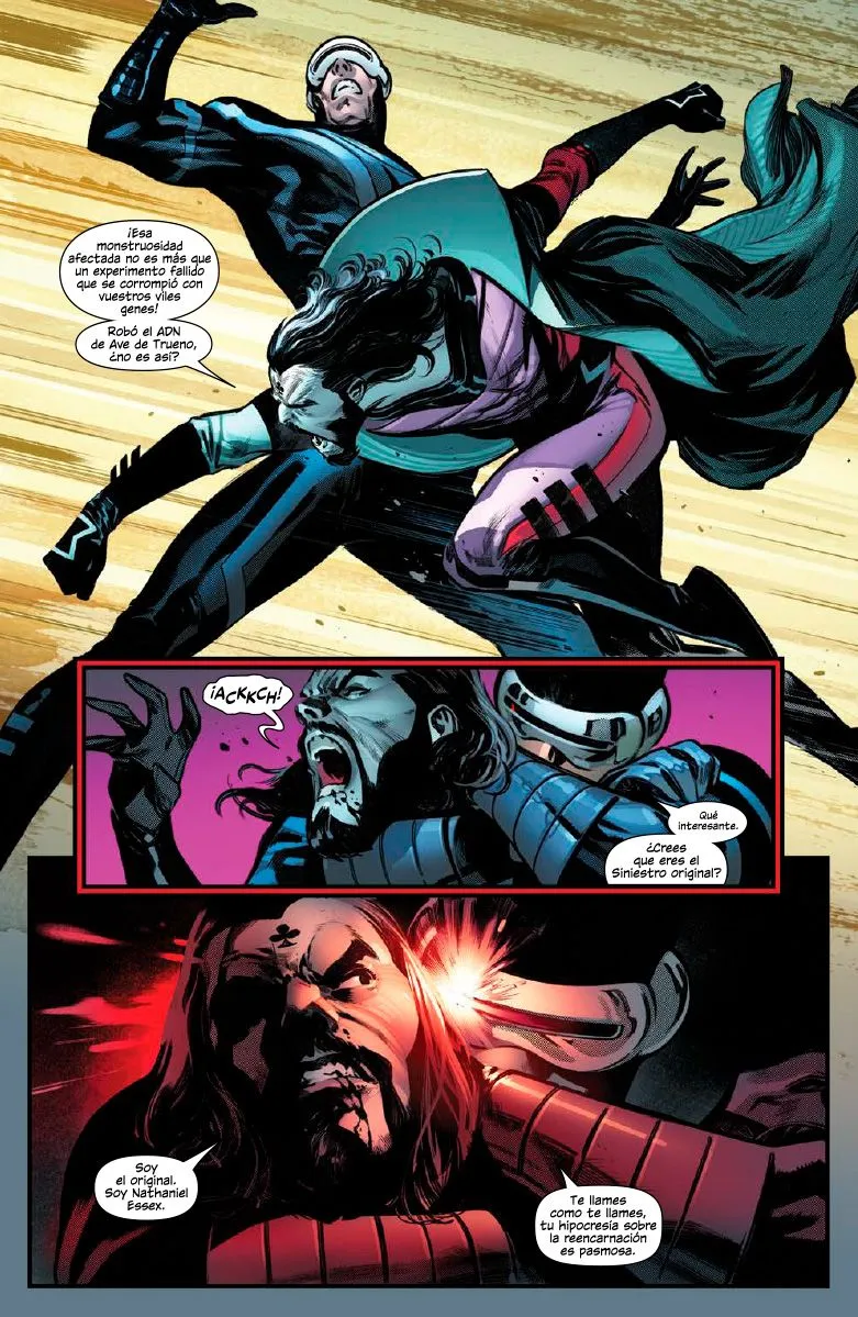 Además, en la mejor tradición mutante desde Claremont, Duggan mantiene la amenaza del Dr. Éstasis asociado a Orchis activa con nuevas revelaciones impactantes. Conocer que Éstasis es el Nathaniel Essex humano original abre muchos interrogantes, lo que me invita a pensar que Siniestro va a ser un personaje importante en el futuro mutante. Personalmente no puedo entender la fascinación que la oficina mutante tiene con Siniestro, un villano de tres al cuarto que nunca me gustó y tampoco ahora.