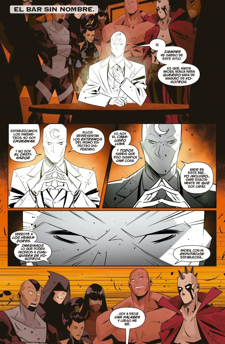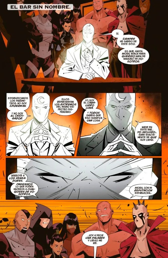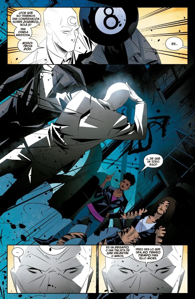 Lamentablemente, Cappucio sigue siendo un narrador muy muy normalito, con unas escenas de acción confusas y una repetición de primeros planos con caras con un toque cartoon con el que no conecto nada. ¿Puede un dibujante gustarme mucho cuando dibuja a un personaje (dos si incluyo a Luna de Cazador y en general el mundo de Khonshu) y mucho menos cuando dibuja a todos los demás? Acaba de pasar. En este tomo tenemos también al dibujante Federico Sabbatini dibujando el número 7 y el One-shot Devil’s Reign: Moon Knight. Y la verdad es que estos fill-ins hacen bueno a Cappucio, así que ya imagináis el nivel de Sabbatini.