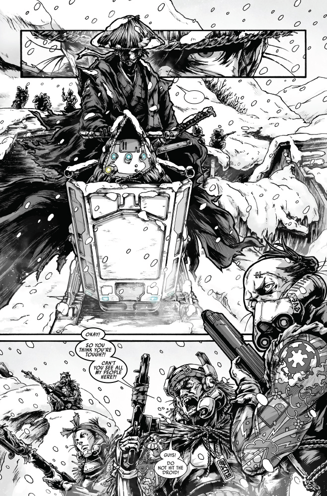 Lo mejor del cortometraje era la propia animación y cómo una historia casi en blanco y negro sorprendía al espectador cuando el Ronin desenvainaba su sable laser rojo característico de los Siths. Y Okazaki traslada perfectamente este estilo al comic, planteando dos escenas de acción que me parecen estupendas, de nuevo recordando al cortometraje de la mejor forma posible.