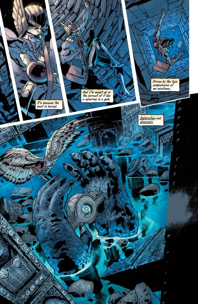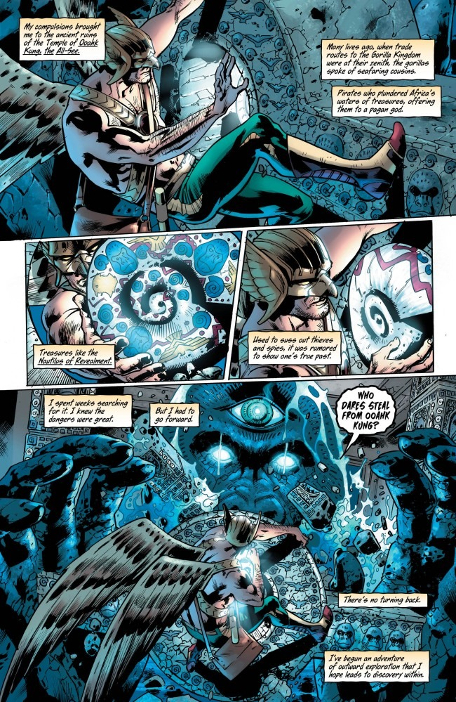 Empezando a valorar Hawkman, tengo que decir que el comic me ha volado la cabeza. Empezando por el hecho que Robert Venditti plantea una historia completa con principio y final que sirve como blockbuster palomitero que sabe sacar todo el partido a los puntos fuertes de Hitch para ofrecer una aventura más-grande-que-la-vida en la que el destino de la Tierra está en juego. Pero además de esto, Venditti encuentra una forma brillante de enlazar las múltiples encarnaciones del personaje en una historia que tiene sentido y que pone orden en uno de los personajes más caóticos del catálogo de DC Comics. Sólo por esto último, DC tendría que hacerle un monumento a Venditti, que triunfa absolutamente con la historia de origen de Hawkman y el motivo real de las reencarnaciones sucesivas que ha ido sufriendo el personaje, que abarca mucho más que el antiguo Egipto como se pensaba hasta ese momento.