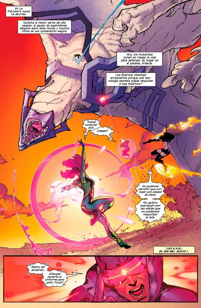 Empezando a ver el vaso medio lleno, estos dos números tie-ins del evento V.X.E. El día del juicio son un perfecto ejemplo de un evento que ha tenido un montón de giros y sorpresas en sus seis grapas USA (4 en la edición española de Panini). Así, en el primer número tenemos a la Patrulla X luchando contra los ataques de los Eternos liderados por Druig a la isla de Krakoa, lo que fue la primera parte del evento. A continuación, en la portada y en tres páginas interiores del número 14 asistiremos al juicio de Cíclope a manos del Celestial Progenitor, que significó el giro de mitad del evento. Esto muestra la amplitud y posibilidades que la historia de Kieron Gillen ofreció a las colecciones involucradas en el evento durante estos meses.