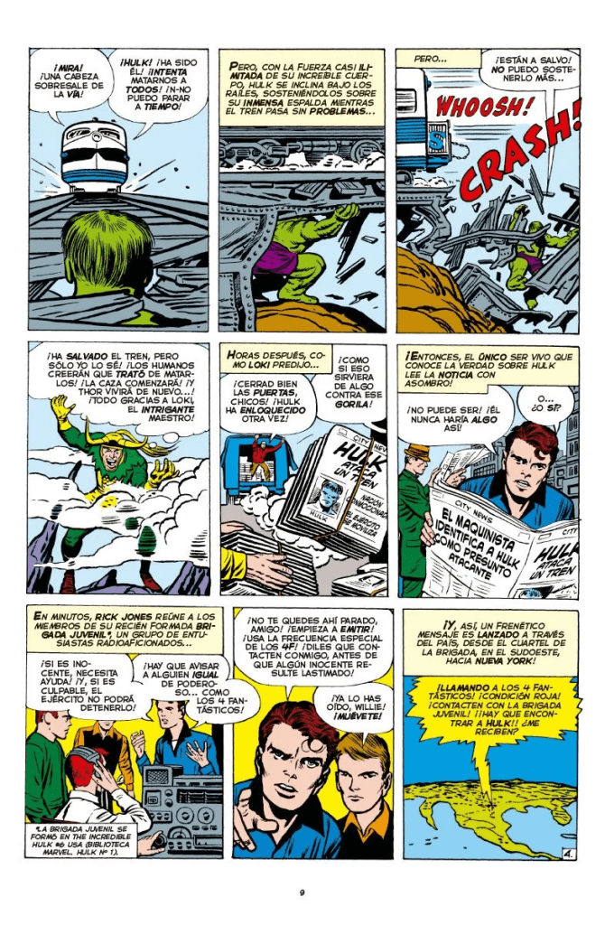 Otro tema es el dibujo de Jack Kirby, con entintados de Dick Ayers (nº1), Paul Reinman (nos. 2, 3 y 5) y Chic Stone (nº6). Es curioso que justo el cuarto número con la presentación de Capitán América sea el único entintado por él, como si de alguna manera sintiera que ese comic SI iba a ser importante, mientras que los otros son un encargo más dentro de los muchos que tenía mensualmente en Marvel. Un comic que por cierto tiene una mayor expresividad que los otros comics, entiendo que provocado por el entintado de Kirby, respecto al resto de comics con un entintado más «mundano». Kirby es una de las fuerzas creativas del mundo del comic, pero como ya le pasó también en 4F, está en estos primeros comics haciéndose con la colección y no son ni mucho menos sus mejores trabajos. De hecho, hay algunas caras realmente feas y hasta poco acabadas (de nuevo, con ojos de 2023) que no hacen agradable la lectura del comic. Tengo que reconocer que nunca he sido demasiado fan de Kirby, y volver a leer estos comics me hicieron recordar cómo cuando leí por primera vez sus comics en la edición de Vértice, Kirby me parecía «viejuno» con un estilo mucho menos guay que el de George Pérez o John Byrne, que siempre me gustaron más.