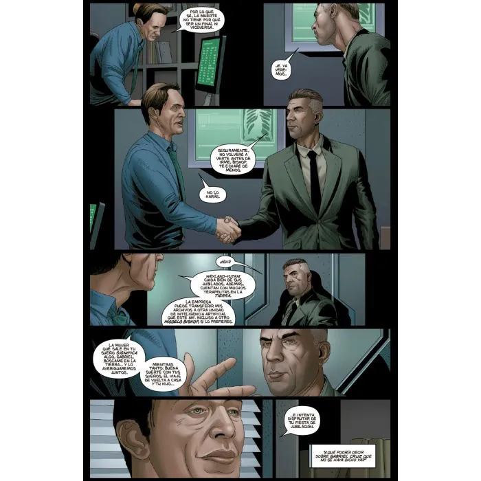 Pero Larroca se ha convertido en un artista ilegible desde que decidió su estilo actual supuestamente hiper-realista copiando de frames de películas que arregla ligeramente con el photoshop, para que parezca un trabajo propio y no tracing. En este comic, Larroca copia la cara de Lance Henriksen (Bishop), pero cada vez que aparece me da un repelús tremendo. Tengo claro que Cruz y el resto de personajes están «inspirados» de actores o modelos con presencia en redes sociales, aunque no les pueda situar exactamente. Fruto de este efecto copión, tenemos algunas escenas planteadas con todas las viñetas con el mismo punto de vista, en el que los personajes hablan y se mueven, que son lo contrario a «dinámicas». Además, hay también un exceso de primeros planos de las caras de los personajes, o planos medios, que me muestran a un artista con pocas ganas de trabajar, pensando que con dibujar la cara es suficiente para hacer atractiva la historia. (Spoiler: no lo es).