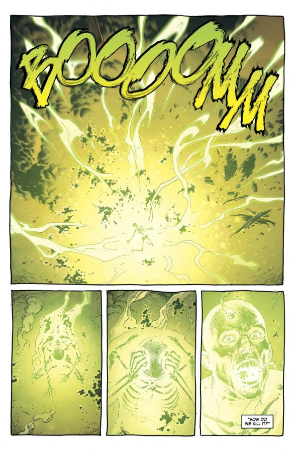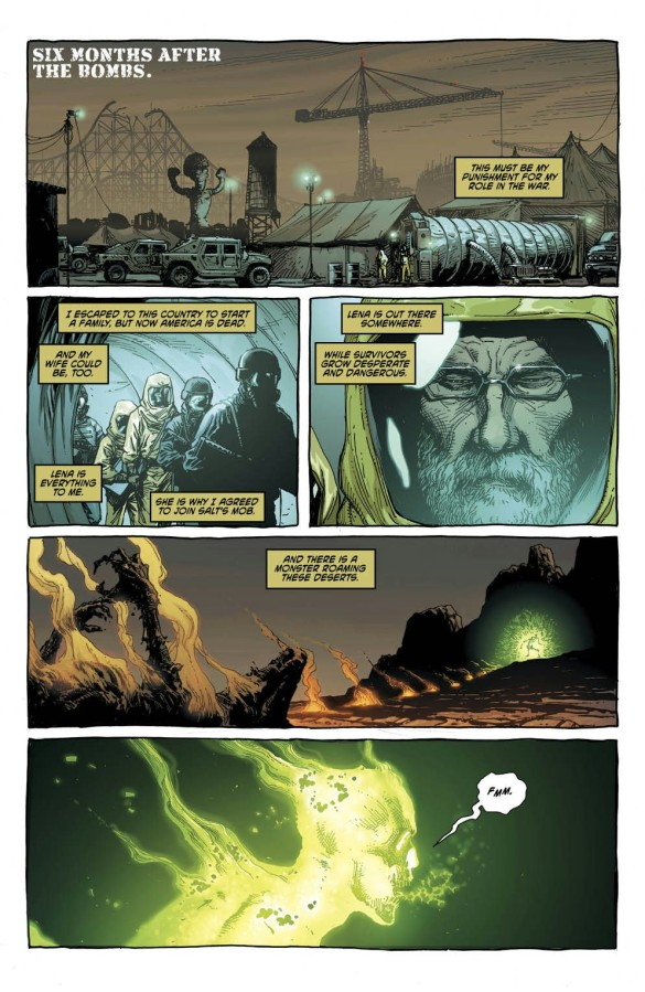 Y entrando en materia ya en este comic, tenemos una historia de origen para los nuevos lectores que tiene un problema de origen, y es que el origen del personaje ya nos lo contaron en la primera miniserie de Geiger. Para no contar lo mismo, Johns usa estas dos grapas para contarnos cómo consiguió controlar sus estallidos radiactivos gracias a las barras de boro. El comic está contado bajo el punto de vista del Doctor Molotov, un profesor de física nuclear que huyó de Rusia antes de la guerra y que se encontrará con Geiger sin él pretenderlo, buscando su ayuda para encontrar a su esposa, de la que se separó al estallar la guerra. En estas dos grapas nos mostrarán la crueldad de este mundo y cómo los inocentes lo tienen muy complicado para sobrevivir.