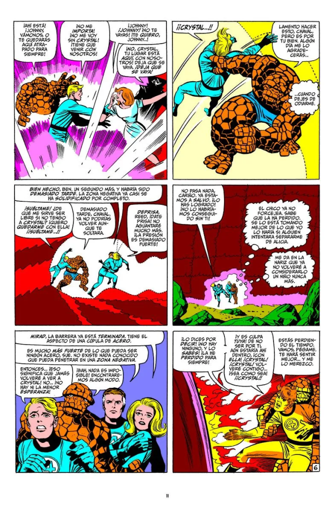 A esto hay que sumar el aspecto que aún no he comentado y que es lo que peor ha envejecido en estos comics: los diálogos. Y entiendo el factor histórico y todo lo que queramos, pero los personajes resultan super antipáticos, por ejemplo con Reed ninguneando todo el rato a Sue. Me ha resultado un suplicio absoluto leer el número 53 USA con T´Challa contando la historia de su pueblo siendo interrumpido de mala manera por Ben Grimm repetidamente, mostrando una falta de educación y una estupidez inadmisible. Es que si se supone que tiene que ofrecer un punto de ligereza y humor, no lo consigue en absoluto, como no sucedía tampoco en los comics de Nick Furia, Agente de SHIELD que leí recientemente.