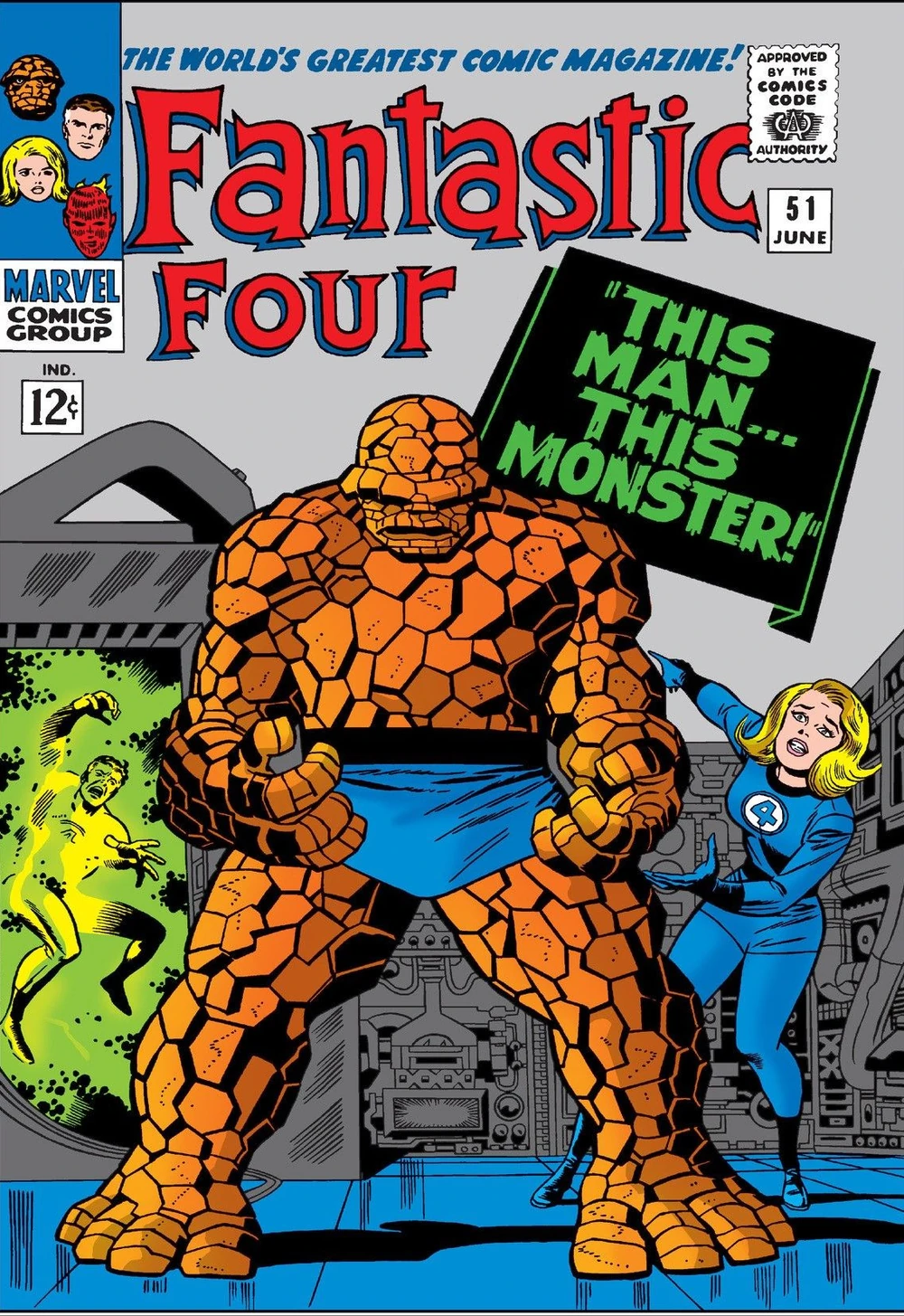 Tras el número 50 llegó «Este hombre, este monstruo», una historia unitaria que rompió las sagas de sagas que se habían leído en los últimos meses, al continuarse inmediatamente los arcos de los 4 Terribles, los Inhumanos y ahora Galactus y Silver Surfer. La idea de un villano suplantando a la Cosa pero aprendiendo de la nobleza que Ben Grimm tiene en su interior es un buen concepto, pero la ejecución de nuevo queda lastrada por la idiotez absoluta de que Ben llegue al edificio Baxter y Reed no reconozca la cara de su mejor amigo. Aparte de la chorrada absoluta de tener a un villano, un científico envidioso del éxito de Reed, que aparentemente muere al final de esta grapa y que Stan lee no se molestó ni siquiera en darle un nombre. Vale que el personaje moría, pero no molestarse en darle un nombre es una idea tremenda. Un error garrafal que se mantuvo durante más de 55 años, hasta que Alex Ross lo «arregló» en Círculo cerrado.