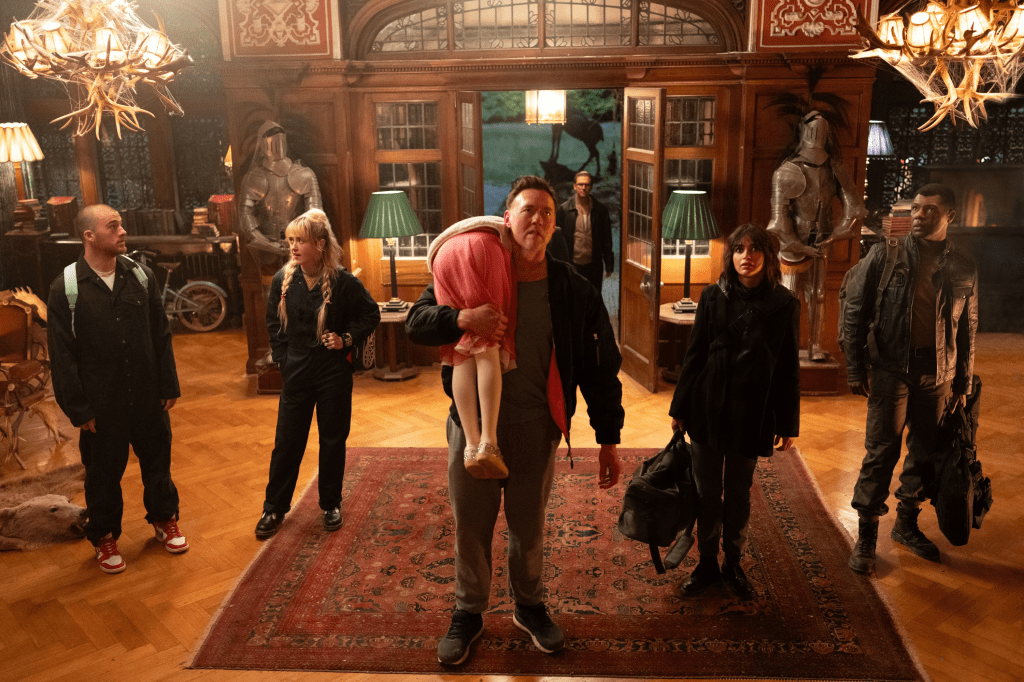 Y es que entrando a valorar al reparto, Dan Stevens roba completamente la película con su creación de un ex-policía al que le gusta el poder sin control, y que se convierte encantado en un vampiro que le dispute el nivel de maldad y sadismo a Abigail. Stevens está on-fire en los últimos tiempos, y la verdad es que cumple siempre da igual el papel que interprete, como acabamos de ver en Godzilla y Kong: El nuevo imperio. Pensando en Don´t breathe que comentaba antes, en la película de Fede Álvarez también había un personaje femenino dentro del grupo de ladrones con la que acababas empatizando. En Abigail ese personaje es Joey, interpretado por Melissa Barrera. Una ladrona adicta a las drogas que intenta compensar el dolor que causó, para lo que necesita el dinero del golpe. Y Barrera lo hace muy bien dando el toque bienintencionado que necesita la película, primero intentando proteger a Abigail cuando piensa que es una niña normal, y luego intentando sobrevivir en una situación de «guatemala o guatepeor.» Completando el trío protagonista, creo que la niña Alisha Weir como la niña vampira Abigail lo hace muy bien, sobre todo en la primera mitad. Cuando se confirma que es una vampira, las prótesis en los dientes y los ojos hace que su interpretación se pierda, al convertirse en varios momentos en un perro rabioso. En lo referido al resto del reparto, creo que todos cumplen con lo que la película necesitaba de ellos, con papeles que tampoco les daban demasiado margen para lucirse, al ser corderos camino del matadero.