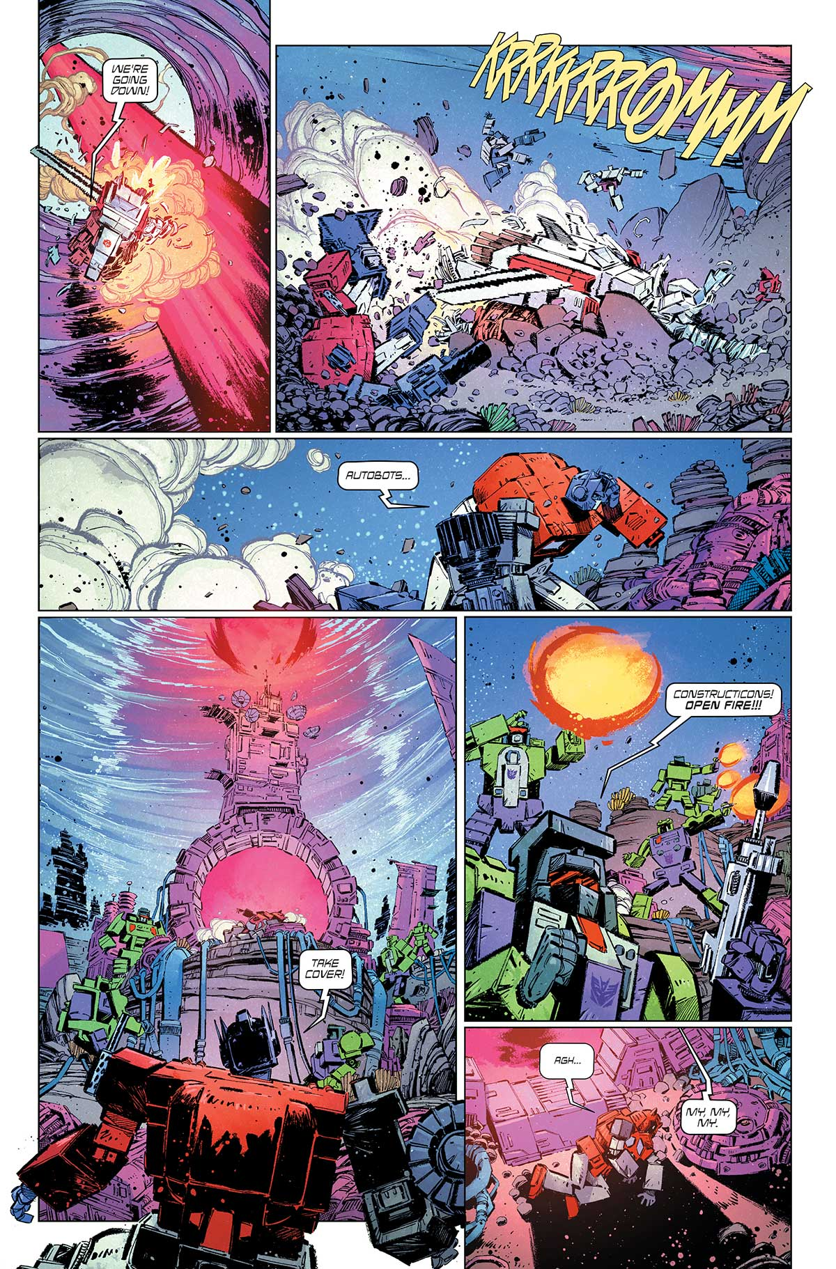 Parece mentira la cantidad de cosas que pasan en las apenas 20 páginas que tiene el comic. Y esto es otro elemento que resalta la habilidad de DWJ como narrador excepcional, pero también el extraordinario trabajo que está realizando Jorge Corona en el dibujo de este comic, acompañado por Mike Spicer. En tan sólo tres números ha hecho suya la colección y casi puede mirar de tu a tu a Daniel Warren Johnson en lo que se refiere a la fuerza de sus imágenes y la narrativa general del comic. Resulta extraño leer un comic mainstream USA con varias páginas con 8 y 9 viñetas, algo imprescindible para poder contar todo lo que sucede en el comic. Frente a tantos comics actuales que se mueven en las 4-5 viñetas por página esta distribución me gusta mucho, porque la sensación que pasan muchas cosas en las grapas de Transformers en realidad no es una sensación, es la realidad de lo que nos ofrecen cada mes. Y yo estoy encantado.
