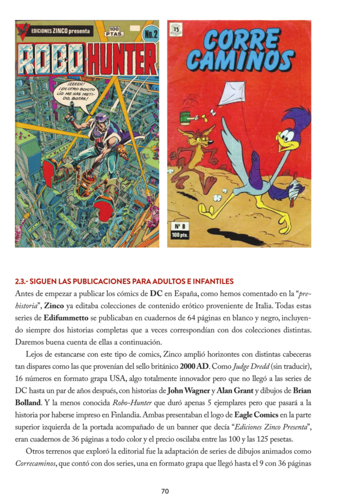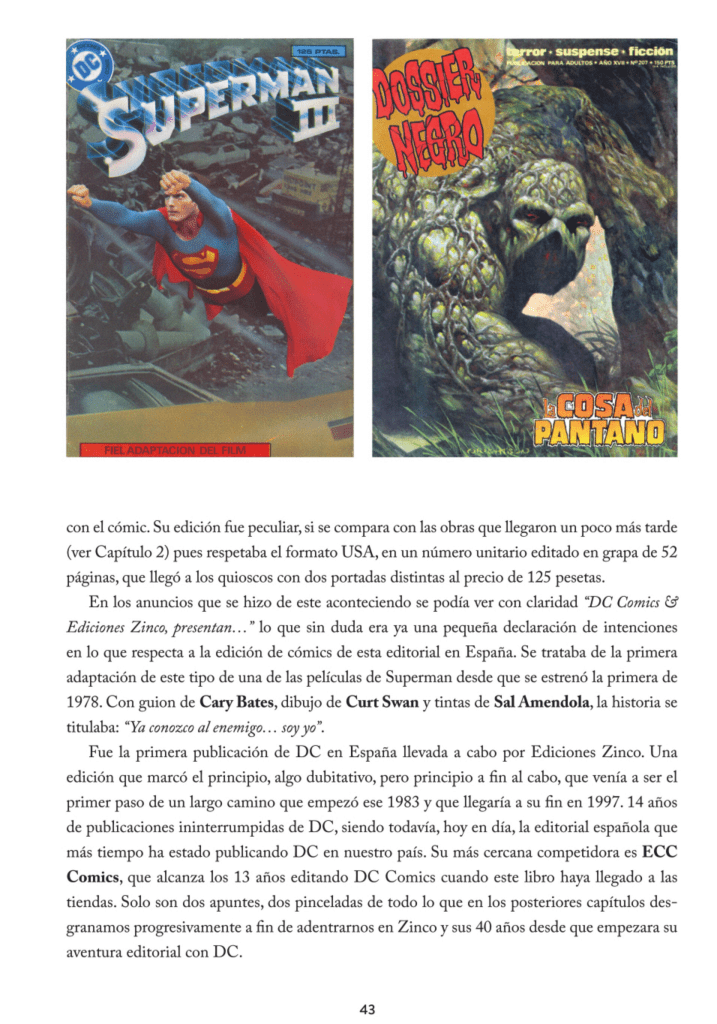 Me gusta el tono académico que plantean Gustavo, Carlos y Enrique para escribir este libro, creo que funciona y le sienta bien. Pero a la vez, cuando hablo de ocasión perdida me refiero a que 35 años después me hubiera gustado que hubiera habido un poco más de «salseo» y se hubiera entrado más a fondo en algunas polémicas o situaciones que nunca han estado del todo claras, como fue la propia pérdida de los derechos de DC por parte de Zinco. O la polémica Forum-Zinco. Está claro que esto es un poco un «wishful thinking» y estoy comentando lo que me hubiera gustado leer y no tanto lo que este libro es en realidad. Pero tras la publicación de este libro, que es muy muy interesante, veo casi imposible que nadie pueda plantear otro en el futuro para hablar de esos mismos años y esta misma editorial desde una perspectiva más «polémica» (el salseo que comento), por lo que estas preguntas van a seguir sin responder. Y me parece una pena.