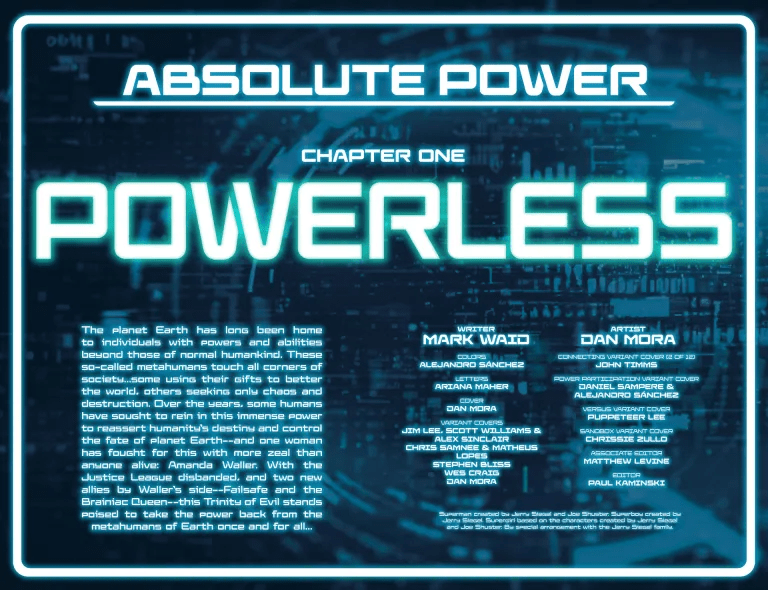 Absolute Power es un evento que va a tener una miniserie principal de tan sólo cuatro números. Aunque este primer número se ha publicado a principio de Julio, el evento contó con un prólogo en junio y terminará en Octubre. Junto a esta miniserie DC ha planteado dos miniseries que complementan la historia: Absolute Power – Task Force VII de 7 números y Absolute Power – Origins de 3. Además, los tie-ins se publicarán en las colecciones de Batman, Green Lantern, Superman, Green Arrow y Wonder Woman a lo largo de los meses de Julio, Agosto y Septiembre. En total, contando el prólogo, son 30 números los que se nos venden como «imprescindibles». O al menos, como pertenecientes a este evento.