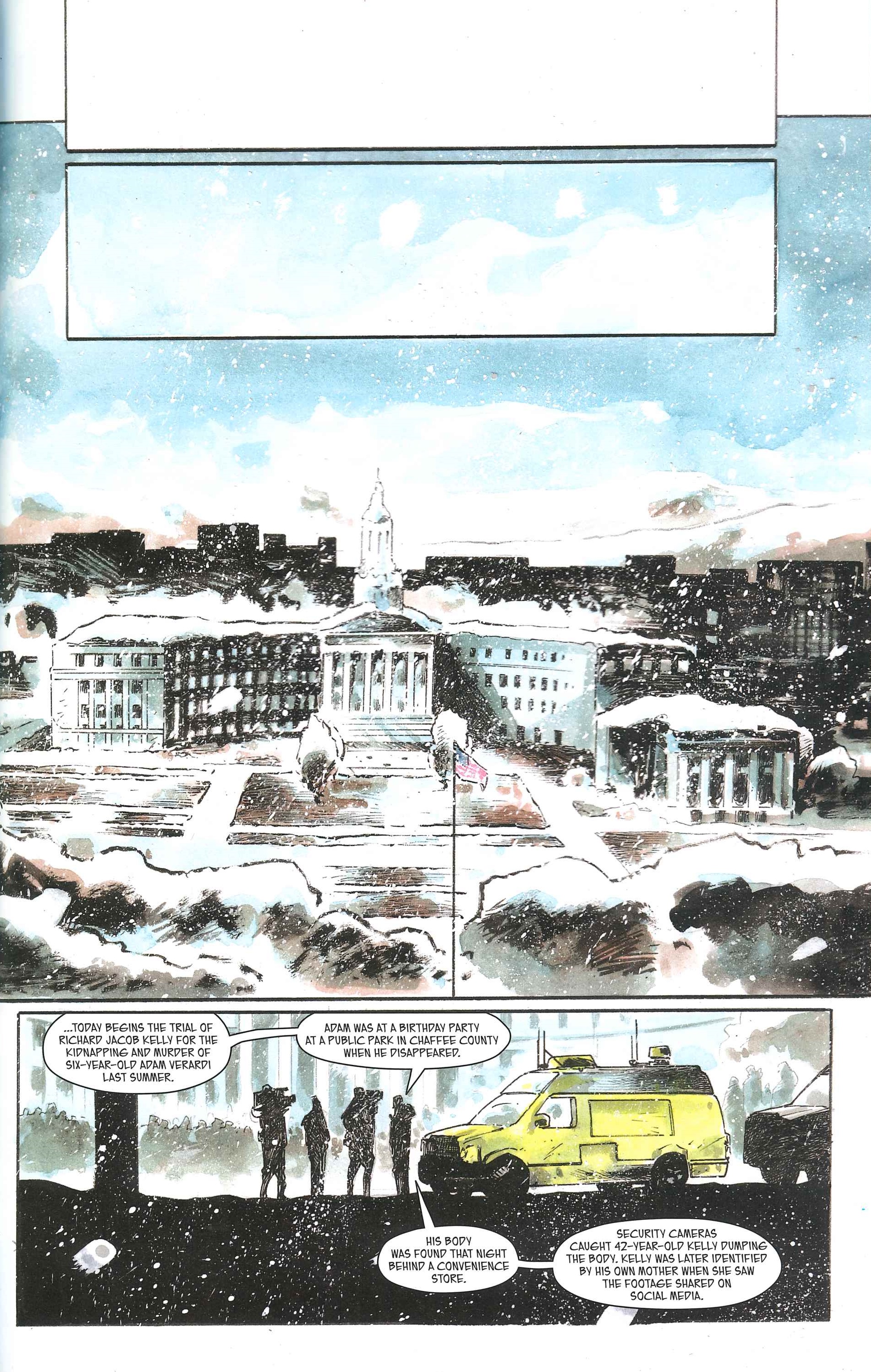 The Blizzard parece un guion de una típica película de terror en la que un grupo pequeño de gente se ve perseguida por algo que los caza uno a uno en medio de la mayor ventisca que se recuerda. La novedad es que el ser parece alimentarse de los pecados que han cometido sus víctimas, que en este caso es un transporte de presos que se dirigía a una prisión. El primer elemento que marca esta comic es que The Blizzard no se trató de una grapa tradicional, sino que era una historia serializada a razón de 8-9 páginas por número de la antología que Image Comics preparó para celebrar su 30 aniversario. Esto provoca que el comic tenga un ritmo poco habitual. Aparte, la extensión de 104 páginas (lo que serían menos de 5 grapas USA) obliga a ir a saco con la historia, ofreciendo lo elementos justos de caracterización para que podamos empatizar con el protagonista, y el resto de convictos y policías que se encuentran en el transporte que se queda atrapado por la ventisca.