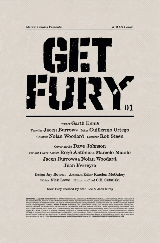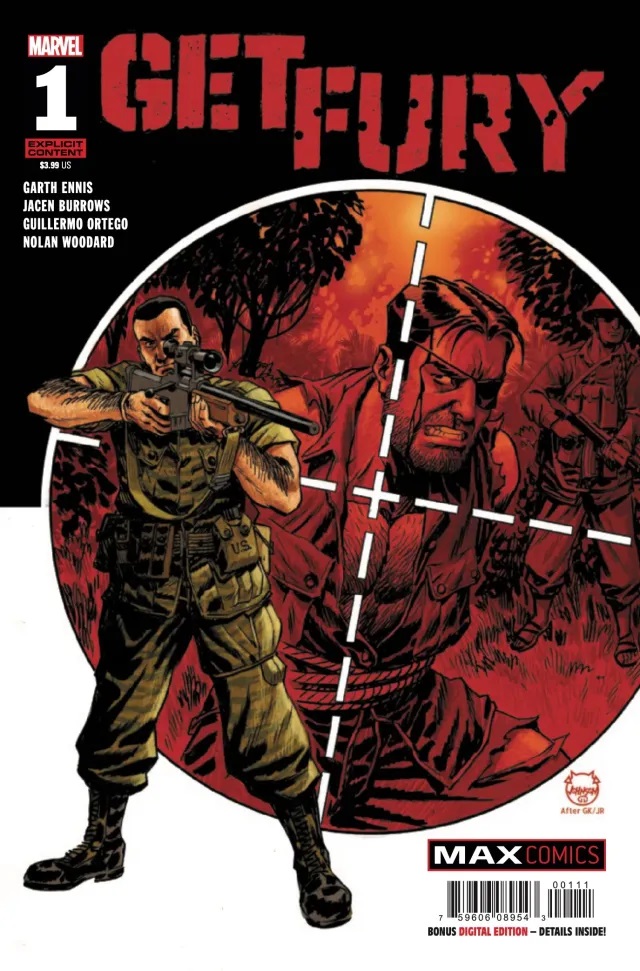 Esta miniserie Get Fury de cinco números vuelve a reunir a Garth Ennis con el dibujante Jacen Burrows, con entintado de Guillermo Ortego y color de Nolan Woodard, además de contar con unas excelentes portadas de Dave Johnson. De momento se han publicado en USA tres números, aunque yo sólo pude leer los dos primeros.