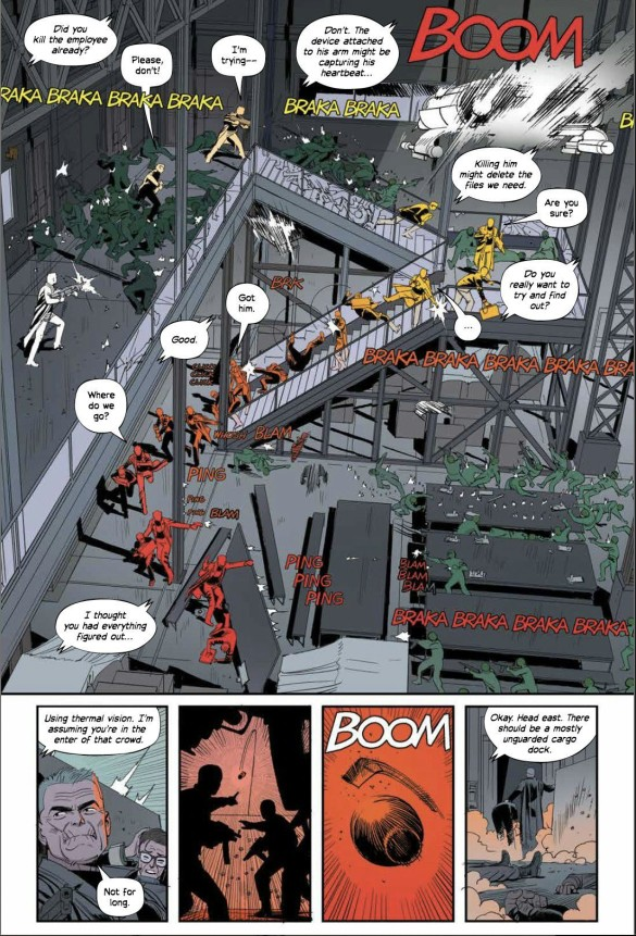 En mi reseña del primer número ya comenté que el problema de este comic es el mismo que el de Scarlett: No he conectado con el dibujo de Andrei Bressan, me parece un artista normalito siendo muuuuuy generoso. Me parece que tiene un dibujo correcto con un toque «feista» que narra la historia de Watters sin llegar a sacarle todo el partido. Tengo que decir que al menos a partir del segundo número ya estaba acostumbrado al estilo de Bressan y el choque visual no ha sido como con la primera grapa. Pero ver algunos combates aéreos en los que parece que las naves están apenas abocetadas por su falta de detalle, unido a unas figuras que me parecen super estáticas, hacen que no disfrute de este comic como me gustaría. O como el guion de Watters planteaba, con montones de situaciones perfectas para el lucimiento del dibujante que Bressan no acaba de aprovechar nunca.