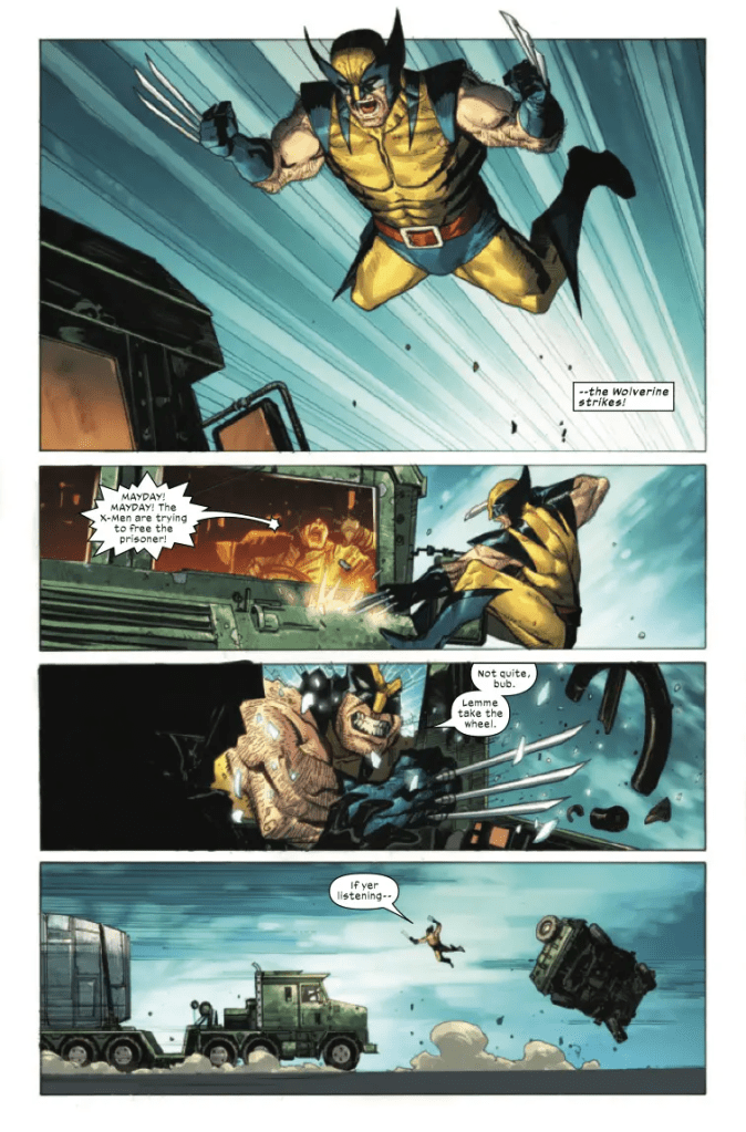 Mirando el vaso medio lleno, entiendo la idea de «vamos a hacer que los principales artistas que han trabajado en la Era de Krakoa dibujen una parte de especial como homenaje para ellos también». En ese sentido, las páginas que más me han gustado son el prólogo de 7 páginas de Joshua Cassara y las 5 páginas de Jerome Opeña, con un interesante color que le dan un feeling diferente al que estoy acostumbrado. Estas páginas rebosan dinamismo y personalidad, y me gustan mucho.
