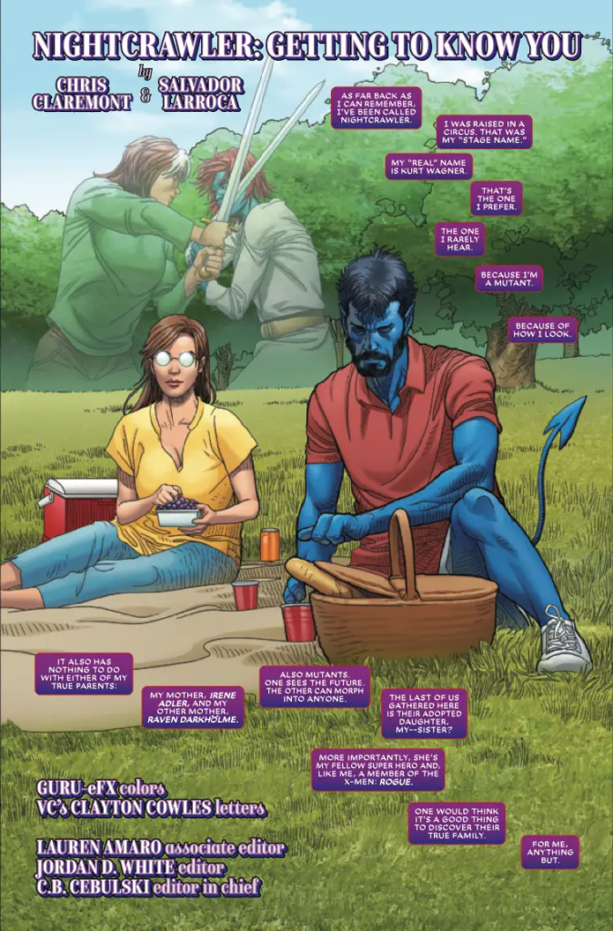 El comic se completa con una historia de 10 páginas de Chris Claremont y Salvador Larroca, con color de Guru-xFX, protagonizado por Rondador Nocturno, Pícara, Destino y Mística, centrado el recordarnos lo disfuncionales que son las familias mutantes y cómo la historia editorial ha ido enrevesándolo toda de forma terrible. La historia alegrará a los fans veteranos como yo que pasamos más de una década disfrutando de Claremont en la Patrulla-X, en lo que sigue siendo la mejor etapa larga jamás publicada en el mundo de los comics. Dicho esto con el máximo respeto hacia los 4 Fantásticos de Stan Lee y Jack Kirby. Pero en realidad ni la historia de Claremont, repitiendo en 10 páginas dos veces la idea clave de la historia por si no la habiamos captado la primera vez, ni el dibujo de Larroca, que no me gusta nada, son especialmente de mi agrado. En todo caso, tenemos una historia curiosa que puede servir a la idea de los editores de unir pasado y futuro de los mutantes en un único comic.