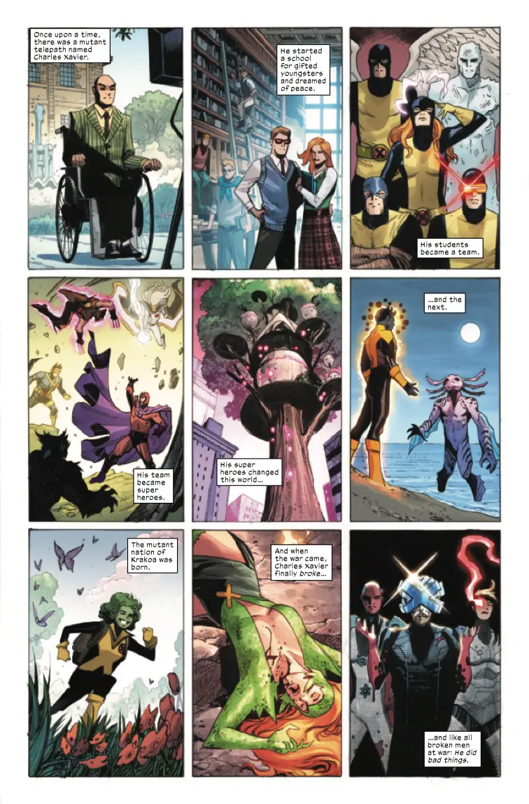 El principal damnificado del final de la Era de Krakoa ha sido Charles Xavier. Los guionistas la cagaron pero bien con la idea de convertirle en villano como forma de poder acceder a Moira MacTaggert para que le ayudara a derrotar a Enigma, el dominio creado a partir del Nathaniel Esex original. Esto puede ser una de las cosas que menos me gustan de estos últimos números de la Era de Krakoa junto a ver a Kate Pryde y a Rondador Nocturno convertidos en asesinos sádicos que asesinan de formas creativas disfrutando con ello. Este epílogo no resuelve los pecados de Xavier, dejándolo en prisión a cargo de humanos dedicados a la extinción de los mutantes, siendo probablemente el principal elemento que quedará abierto de esta Era de Krakoa de cara a la nueva etapa From the Ashes.