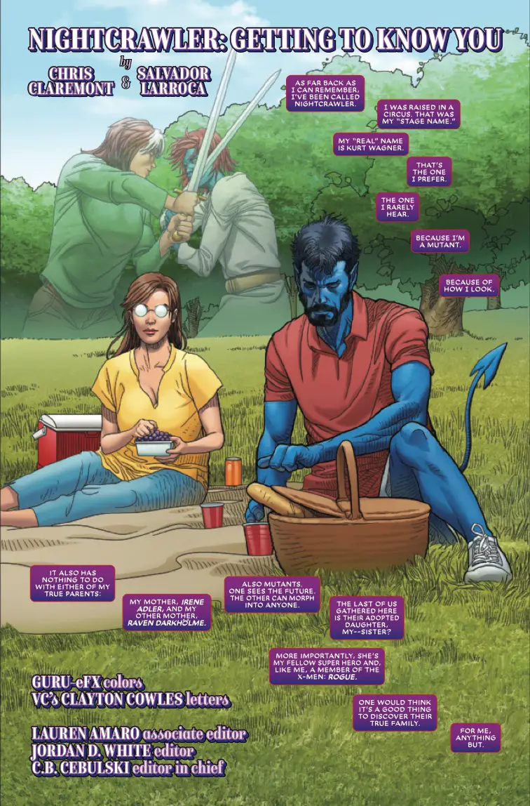 El comic se completa con una historia de 10 páginas de Chris Claremont y Salvador Larroca, con color de Guru-xFX, protagonizado por Rondador Nocturno, Pícara, Destino y Mística, centrado el recordarnos lo disfuncionales que son las familias mutantes y cómo la historia editorial ha ido enrevesándolo toda de forma terrible. La historia alegrará a los fans veteranos como yo que pasamos más de una década disfrutando de Claremont en la Patrulla-X, en lo que sigue siendo la mejor etapa larga jamás publicada en el mundo de los comics. Dicho esto con el máximo respeto hacia los 4 Fantásticos de Stan Lee y Jack Kirby. Pero en realidad ni la historia de Claremont, repitiendo en 10 páginas dos veces la idea clave de la historia por si no la habiamos captado la primera vez, ni el dibujo de Larroca, que no me gusta nada, son especialmente de mi agrado. En todo caso, tenemos una historia curiosa que puede servir a la idea de los editores de unir pasado y futuro de los mutantes en un único comic.