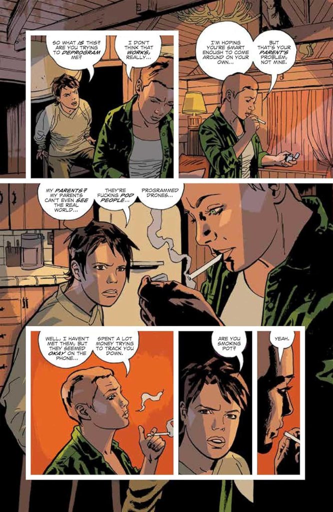 Hablando de sensaciones conocidas, el dibujo de Sean Phillips con color de su hijo Jacob también significa una zona de confort comiquera. Y es que es abrir la primera página y verme transportado a su mundo. Phillips y su hijo tienen la cualidad de añadir una cualidad atemporal a todos sus trabajos. Aunque otras obras de Brubaker y Phillips estaban ambientadas en el pasado, por ejemplo la serie Reckless en el Los Ángeles de los años 80, esta obra plantea una historia en un presente bastante más cercano. Digo esto porque el pánico al satanismo tuvo lugar en los años 80, y la protagonista debe tener 20/30 años, por lo que los sucesos del presente deben suceder pasados el 2000. Sin embargo, el dibujo y sobre todo la paleta cromática de Jacob Phillips parece que nos traslada a un mundo mucho anterior.