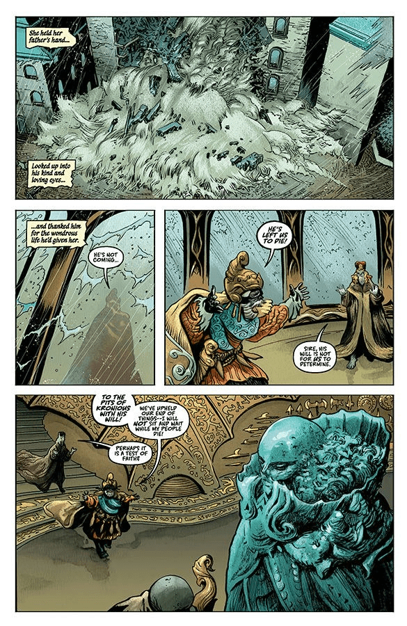 Rick Remender es especialista en crear historia con comentario y crítica social, y en The Sacrificers vuelve a los high-concepts super potentes con unos protagonistas que tienen delante suyo un viaje que les cambiará completamente. La idea de unos Dioses que exprimen la vida de la gente corriente que les adora como forma de mantenerse jóvenes y fuertes es una idea que sirve para criticar no solo a los extremismos religiosos (aunque también) sino a una sociedad capitalista en la que el SISTEMA se aprovecha del débil y ha construido unas estructuras para mantenerles dóciles y sumisos. Este comic es un grito para romper estas estructuras, y de momento nos está ofreciendo momentos crueles y la promesa de una venganza. Así que todo bien.